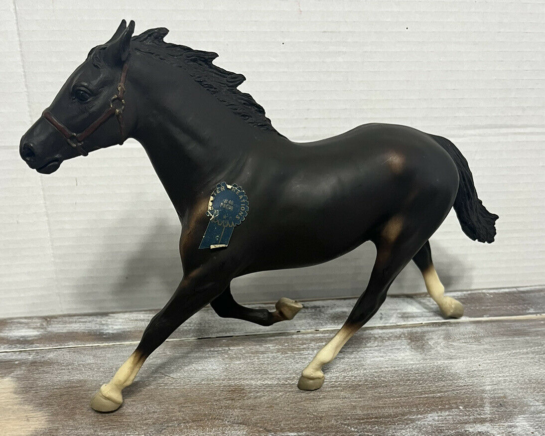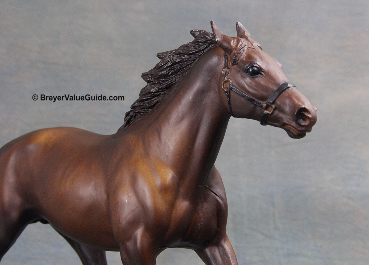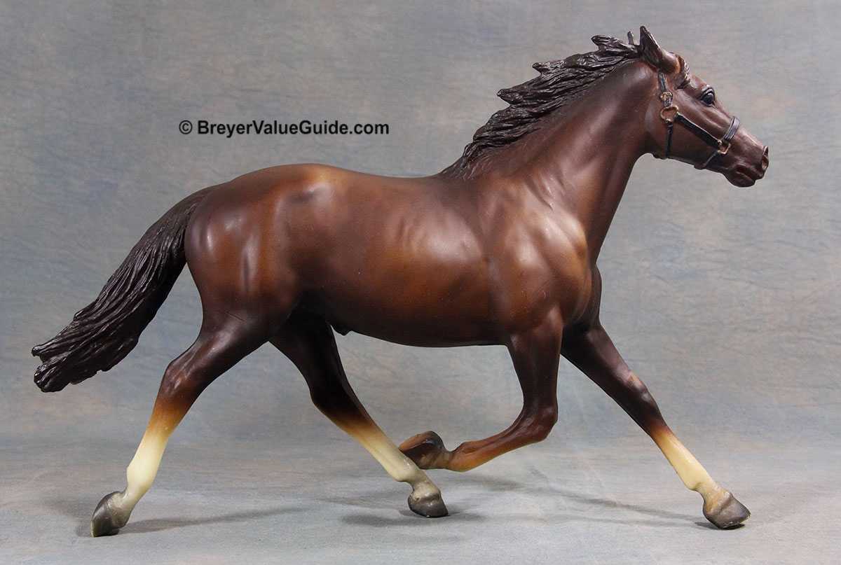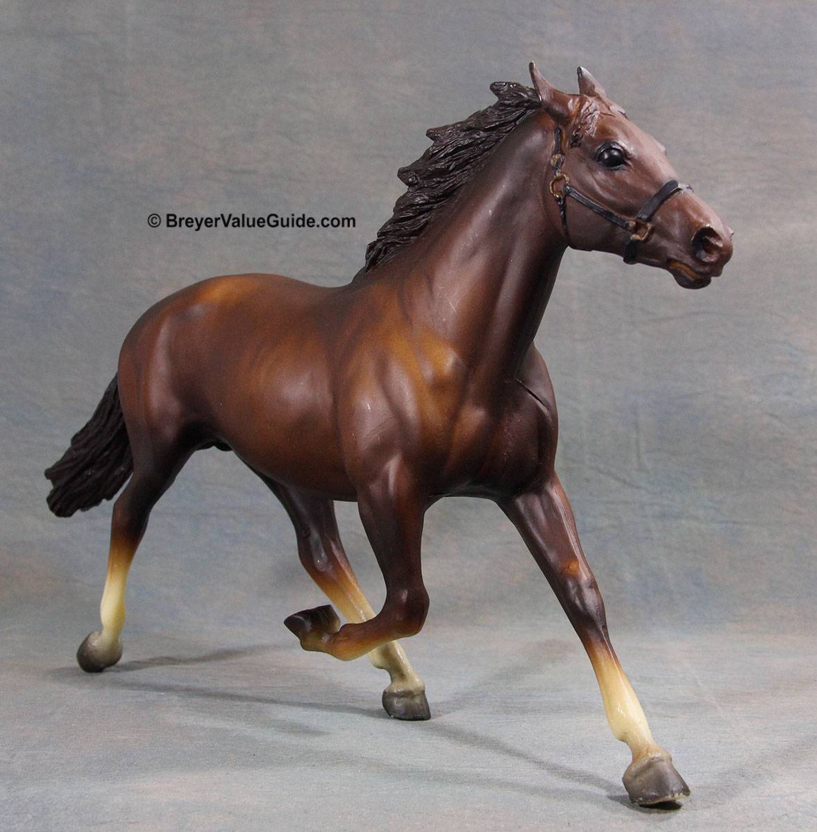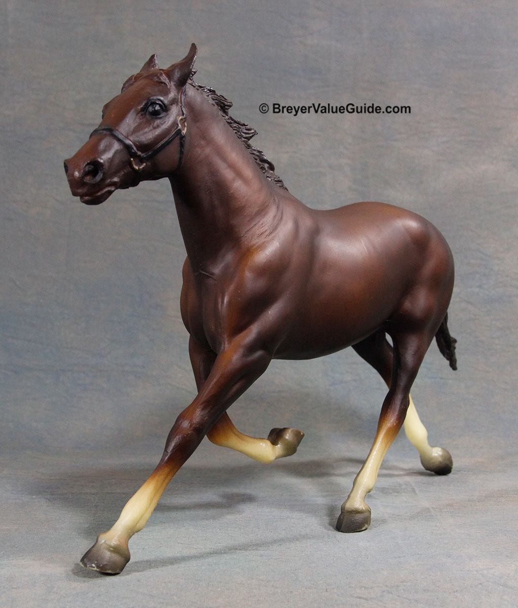 Matte or semigloss liver chestnut or dark bay; solid face; 3-4 stockings; black or red-brown halter