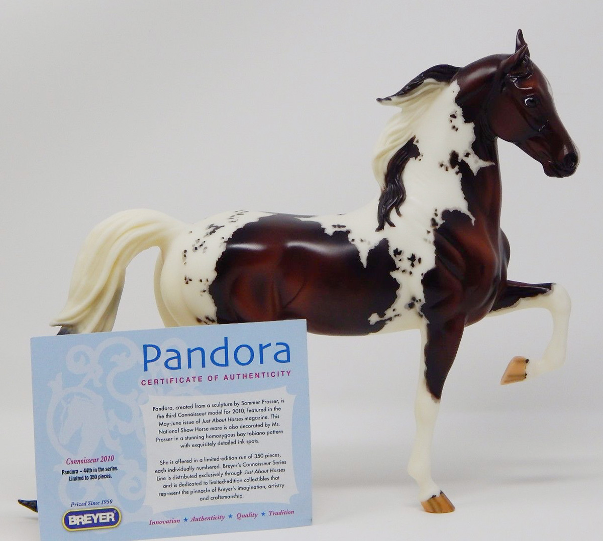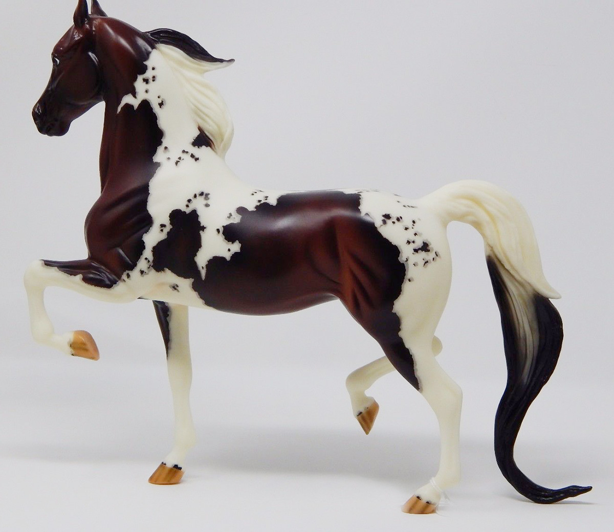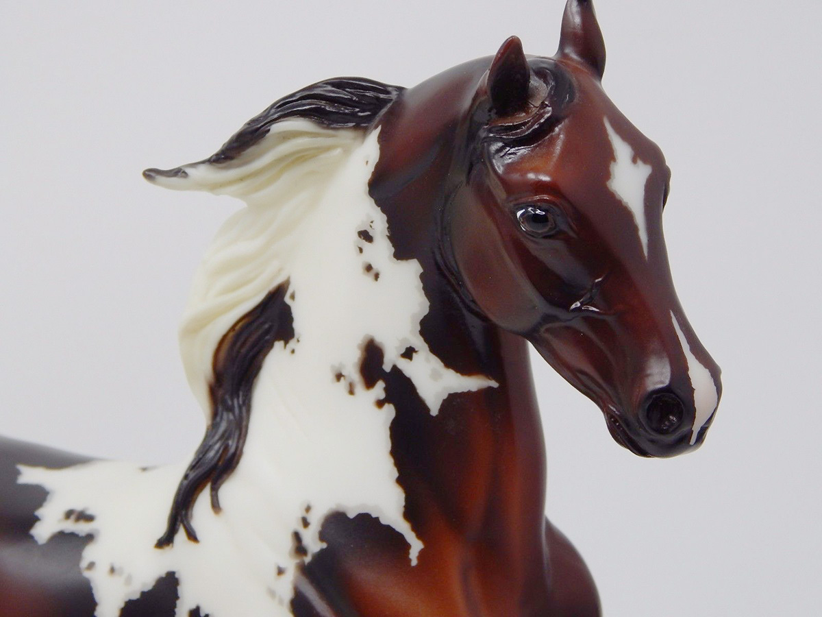 Semigloss bay pinto; cat tracks and mapped markings; star and snip; 4 stockings; striped hooves; Connoisseur SR; 1/350