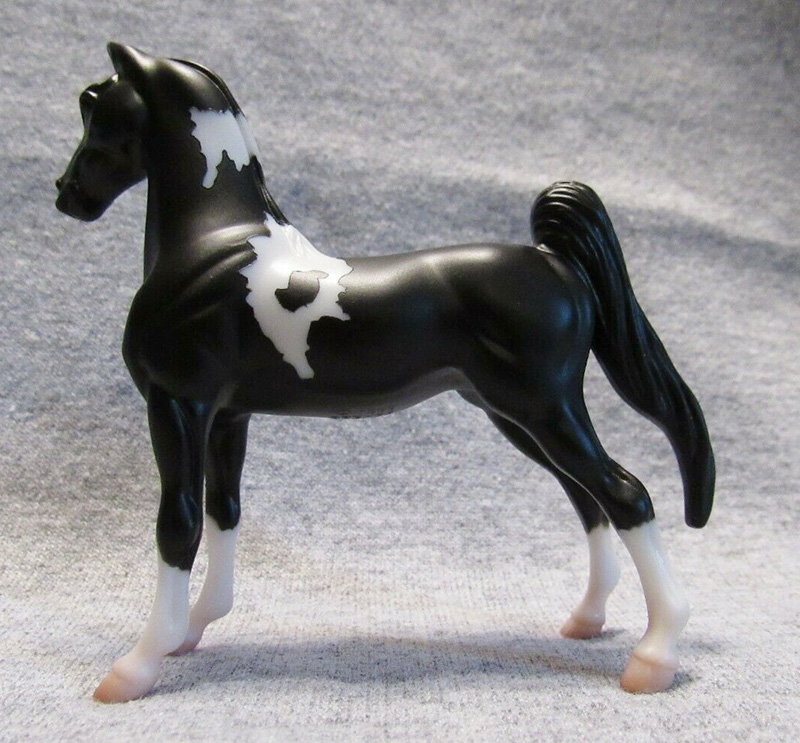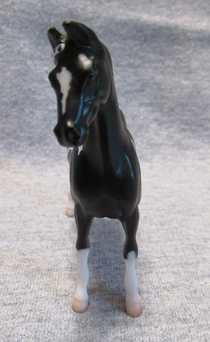 Matte black pinto; elongated star; 4 stockings; blue “v”‘s on white ribbons; JCPenney SR Very similar to #720225 but with different ribbon detail.