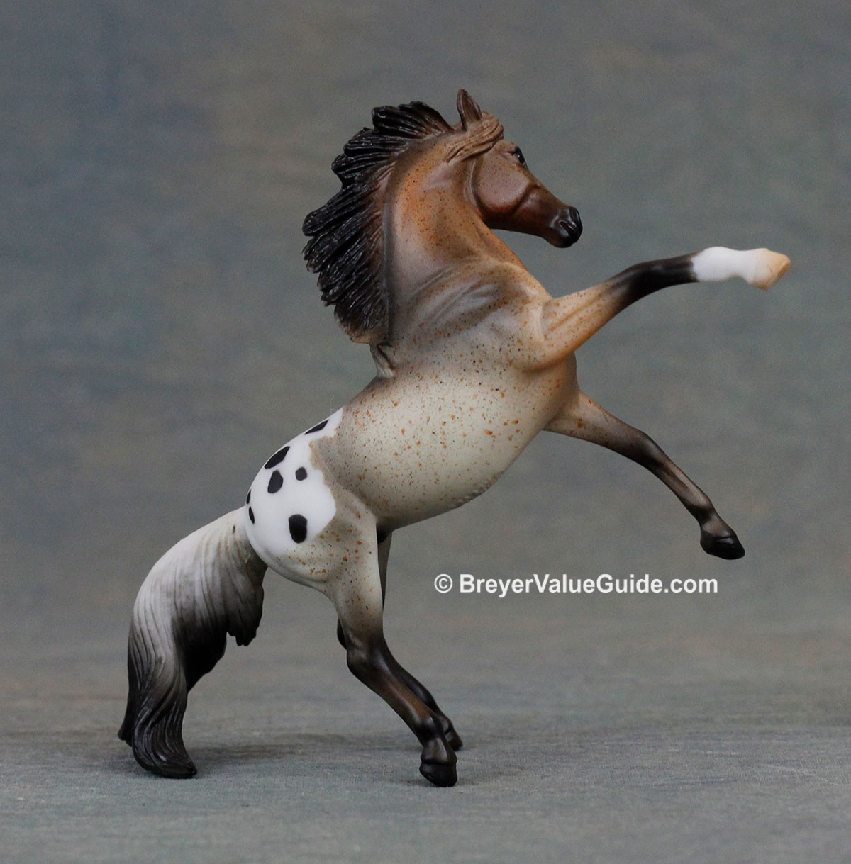 Matte brown blanket appaloosa with roaning; darker mane; white tail with black tip shading; 1 sock; JCPenney SR
