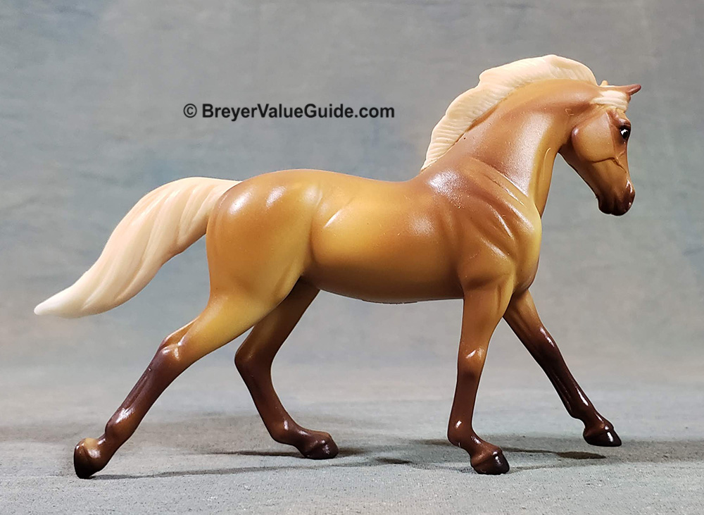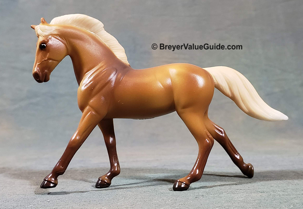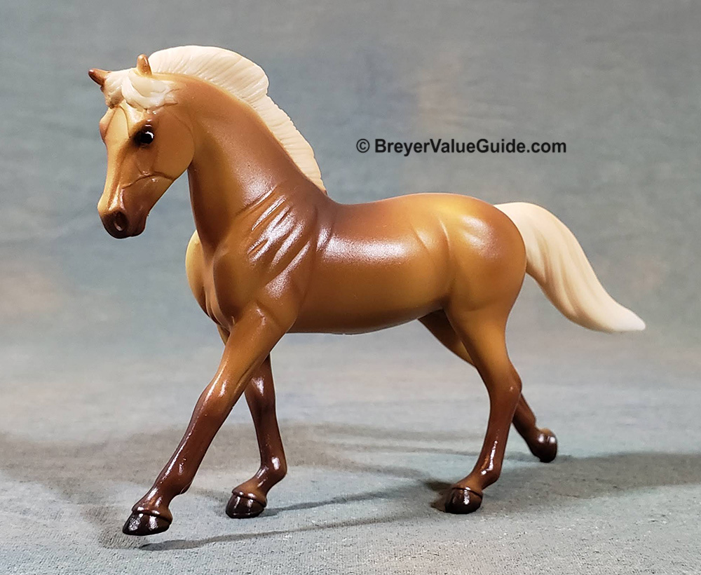 Matte flaxen chestnut; lighter mane and tail; solid face; darker legs; black hooves; JCPenney SR