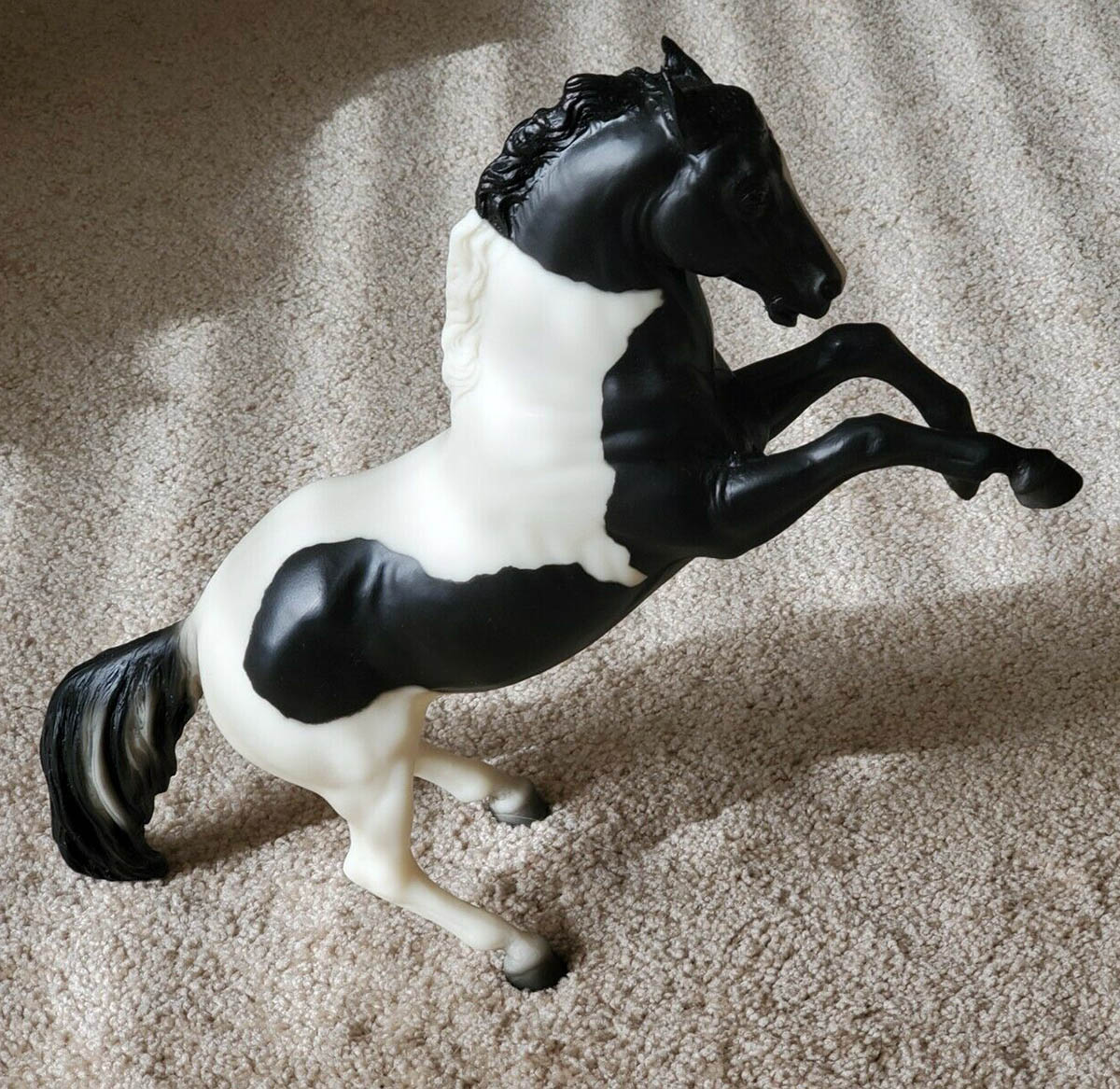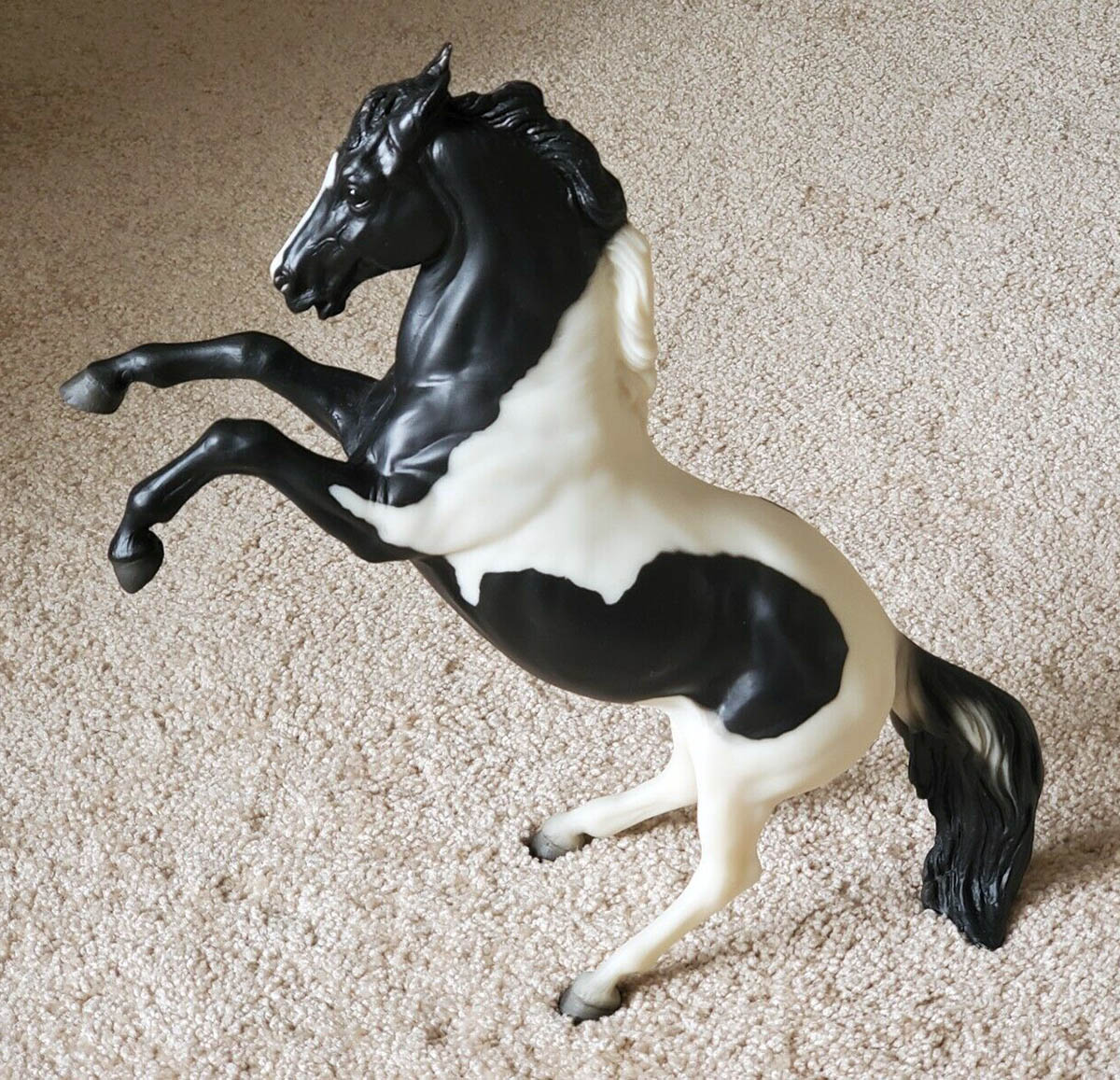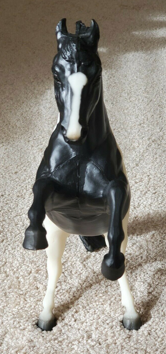Matte black pinto; blaze; white hind legs, black front legs, Sears SR – with Running Foal