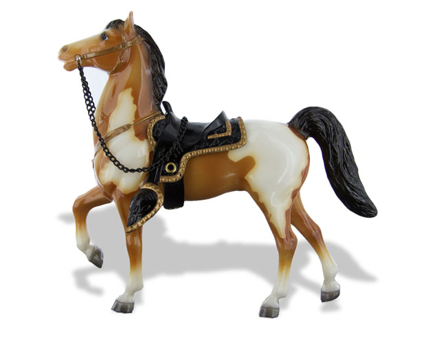 Glossy brown pinto; 4 socks; grey hooves; eye whites; black with gold saddle