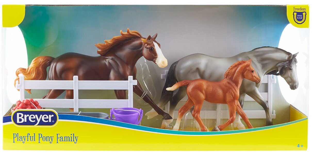 Haflinger Mare – Matte grey, solid face, 3 socks American QH Stallion – Matte dark chestnut, apron face, 2 hind socks Haflinger Foal – Matte chestnut, 1 hind sock Valued as set. Issue price: $55