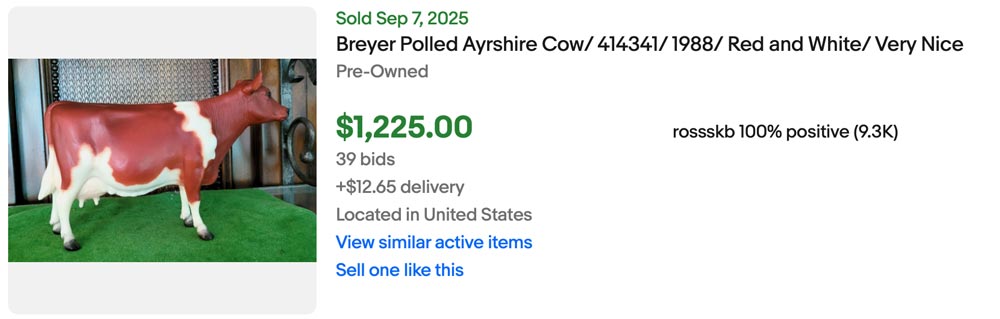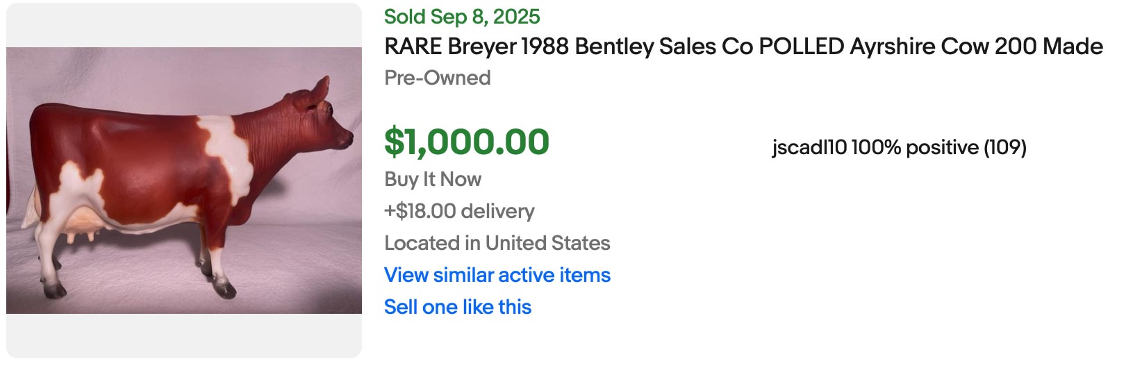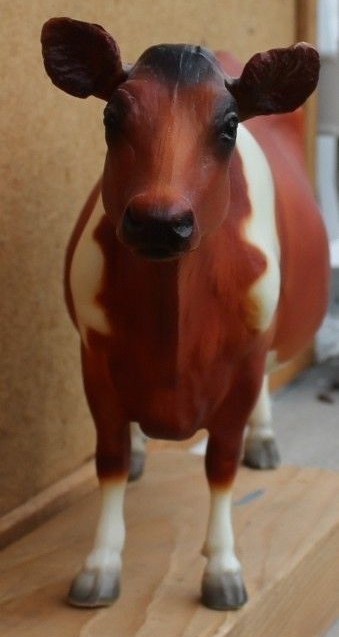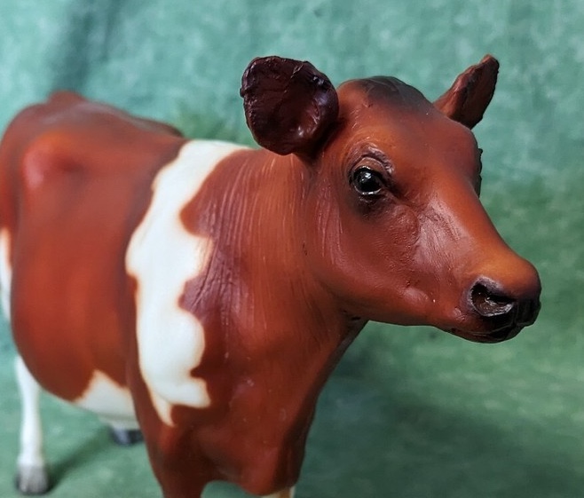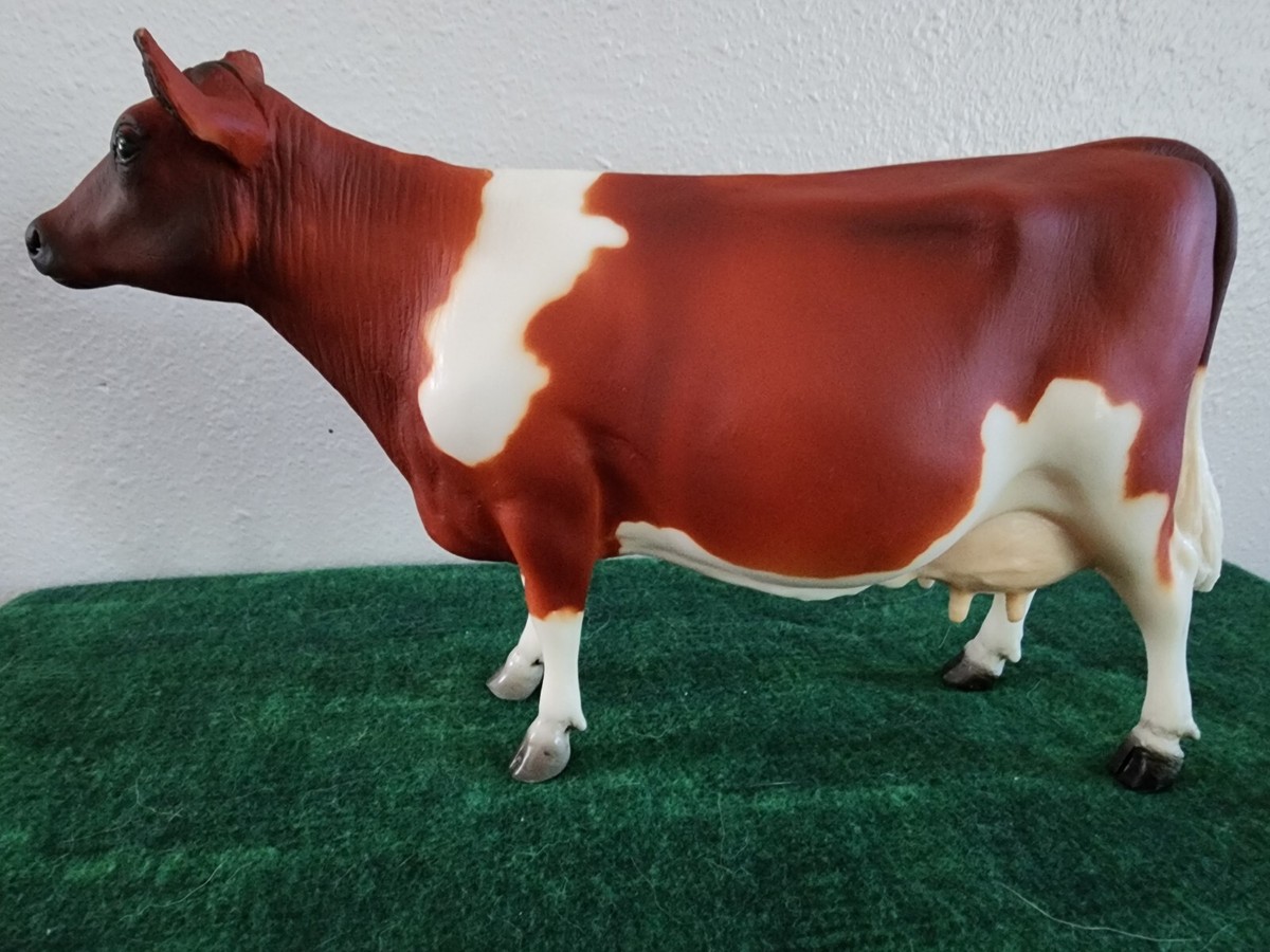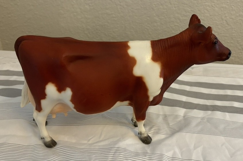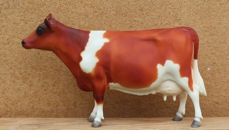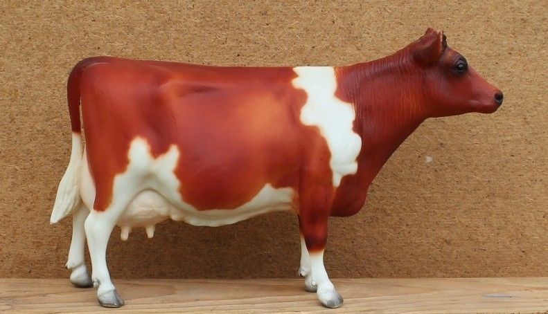 Matte to semi-gloss red and white, solid face, white legs, grey hooves, Bentley Sales Co SR, 1/200 in 1988 Also released in 1993 in the Dairy Cow Assortment SR #410693, 1/200 in 1993