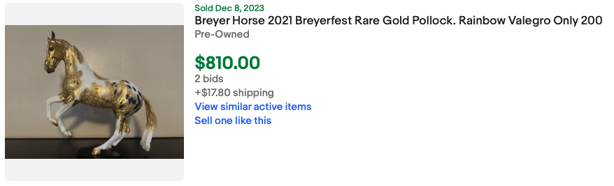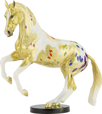 Glossy gold pinto with rainbow appaloosa spots, resist dapples, star-stripe-snip, gold hooves, black base, BreyerFest SR, 1/200 gold version