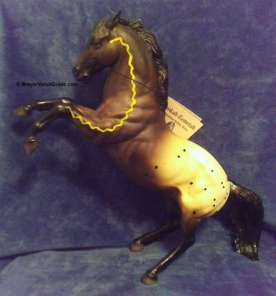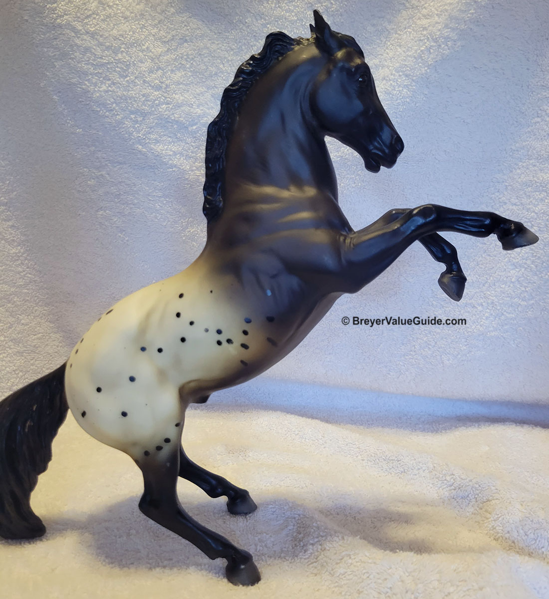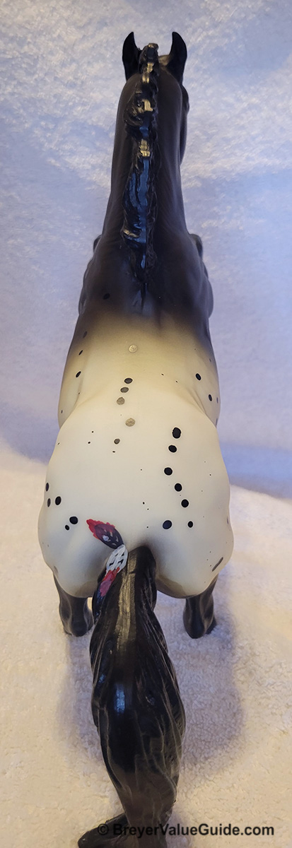 Matte dark bay blanket appaloosa, black splash spots, solid face, black legs, grey hooves, with hang tag