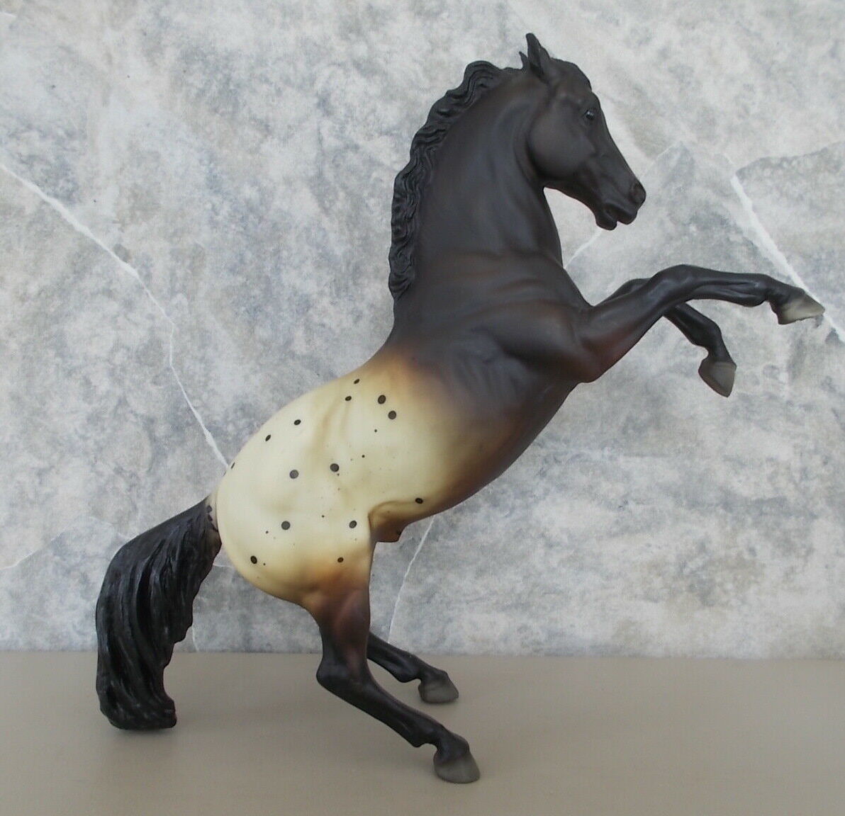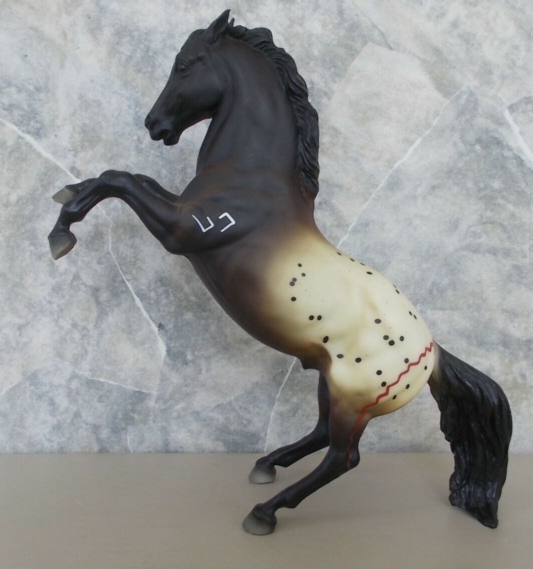 Matte dark bay blanket appaloosa, black splash spots, solid face, black legs, grey hooves, with hang tag Two white staple shapes on left shoulder, red zig-zag line running from base of tail to hock on left side