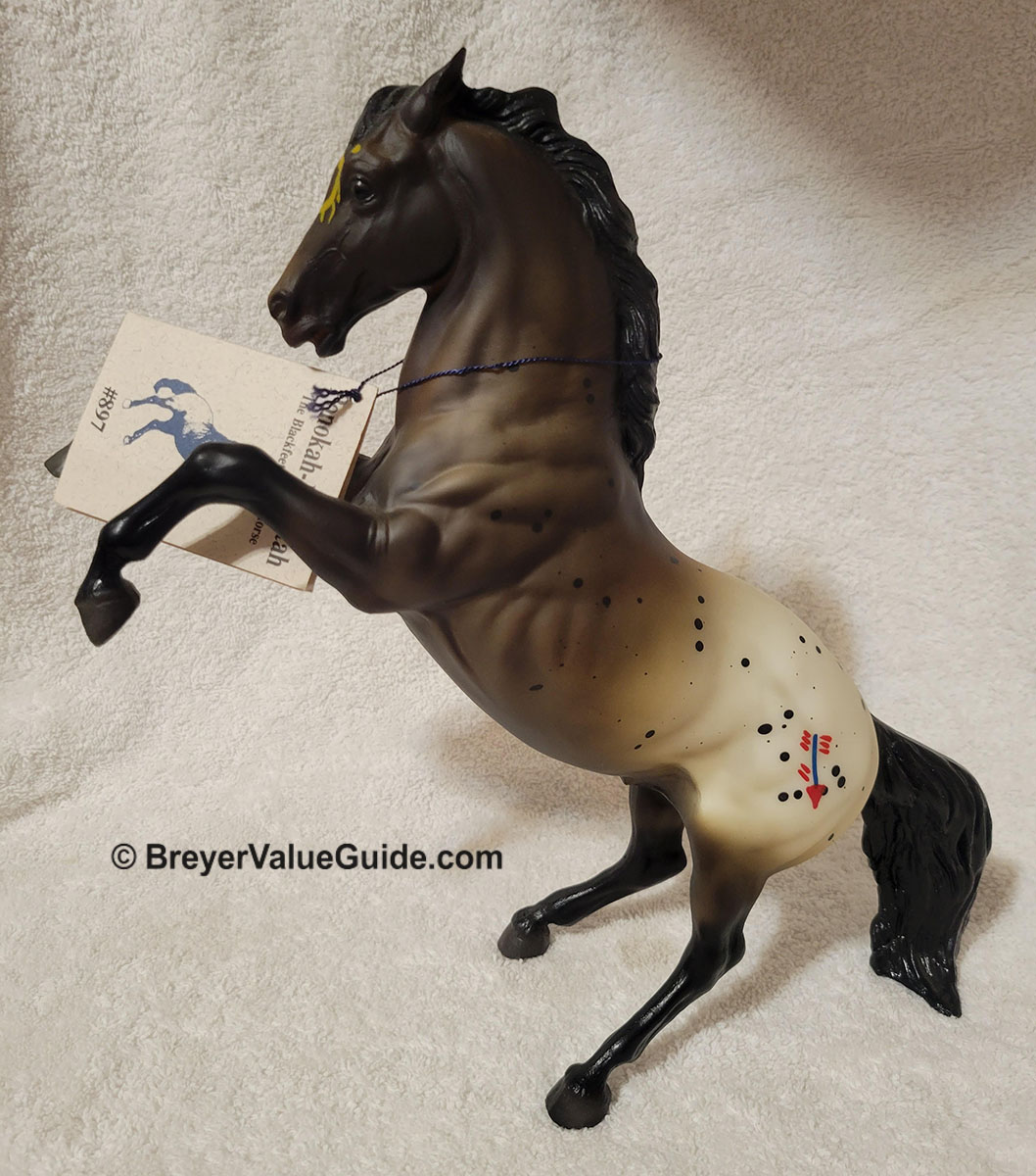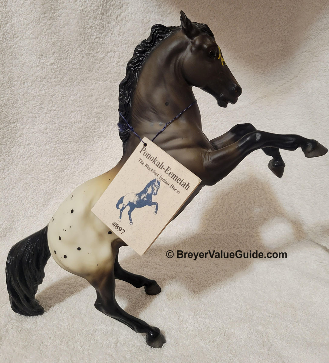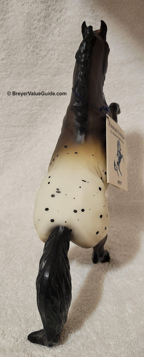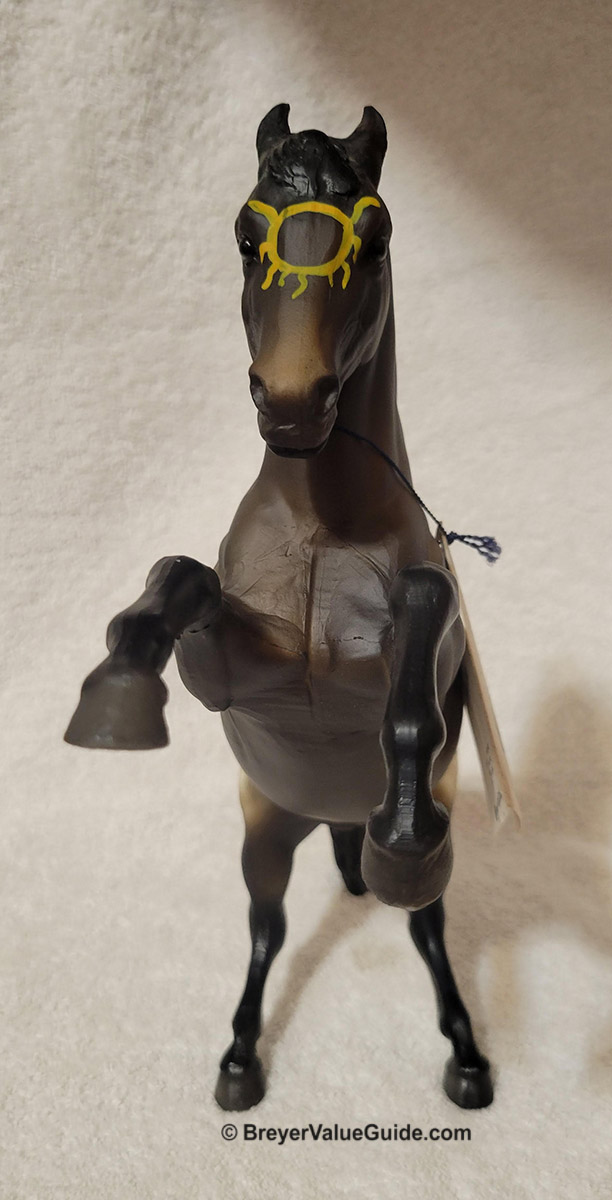 Matte dark bay blanket appaloosa, black splash spots, solid face, black legs, grey hooves, with hang tag Yellow sun on forehead, red and blue arrow on left hindquarter