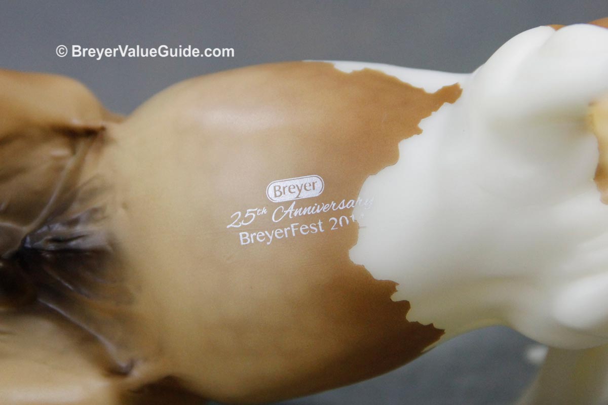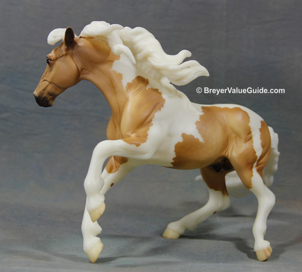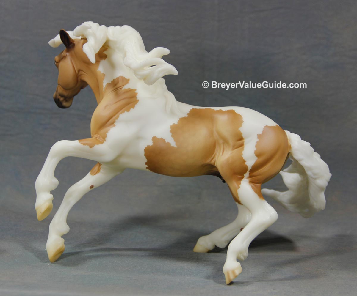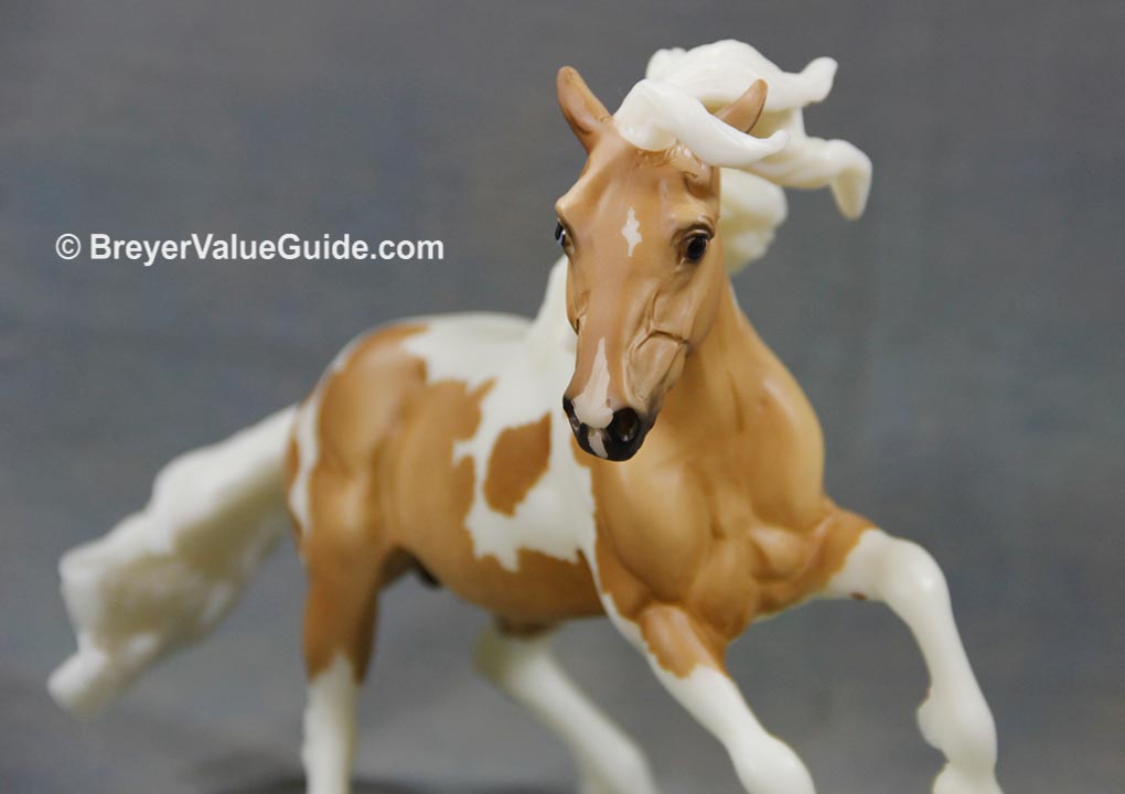 Matte palomino pinto; dapples, star and snip, 1 blue eye, white legs, BreyerFest SR; 1/720