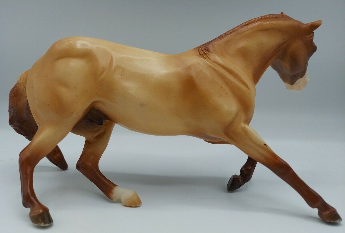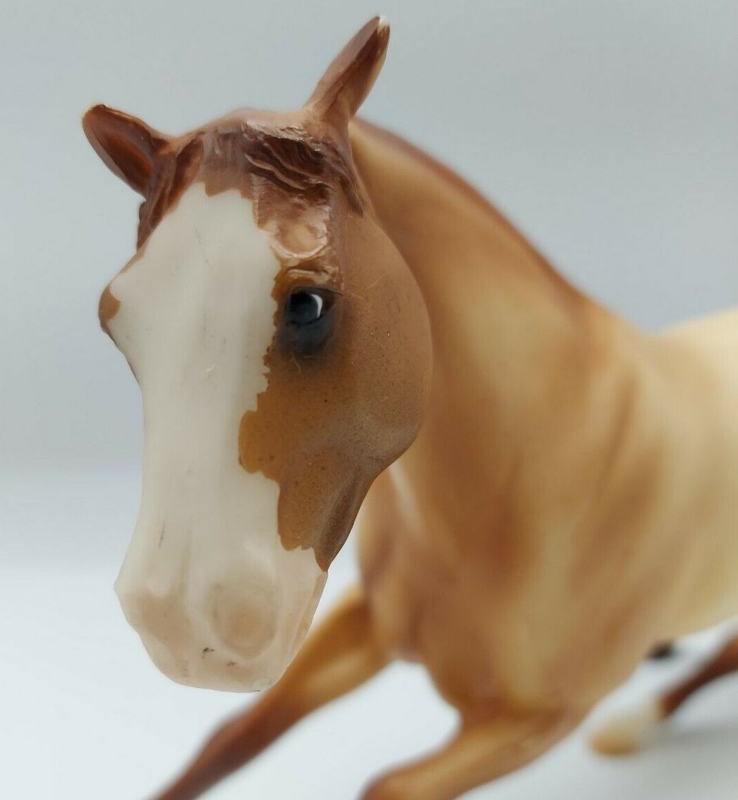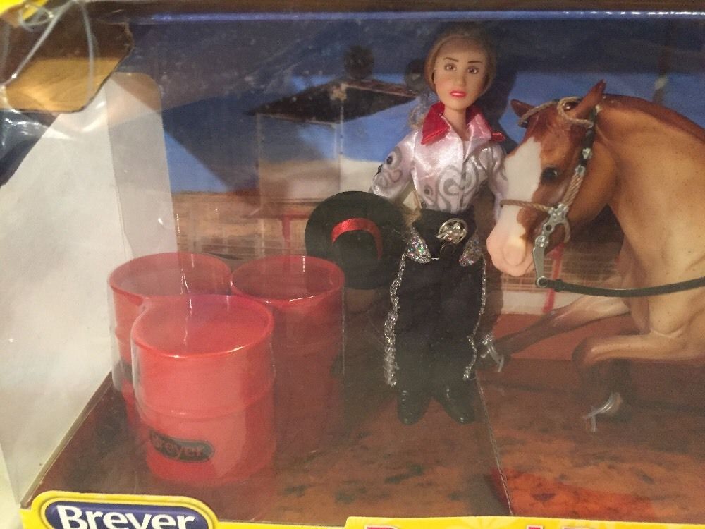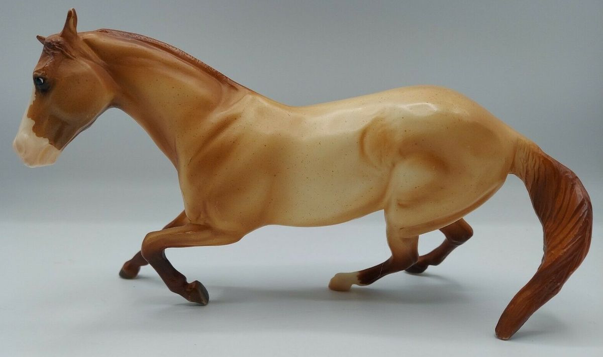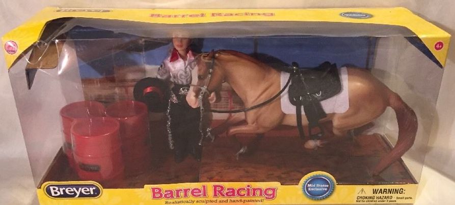 Matte red roan; stenciled apron face; 1 hind sock; includes 3 barrels; rider and western tack; Mid States SR