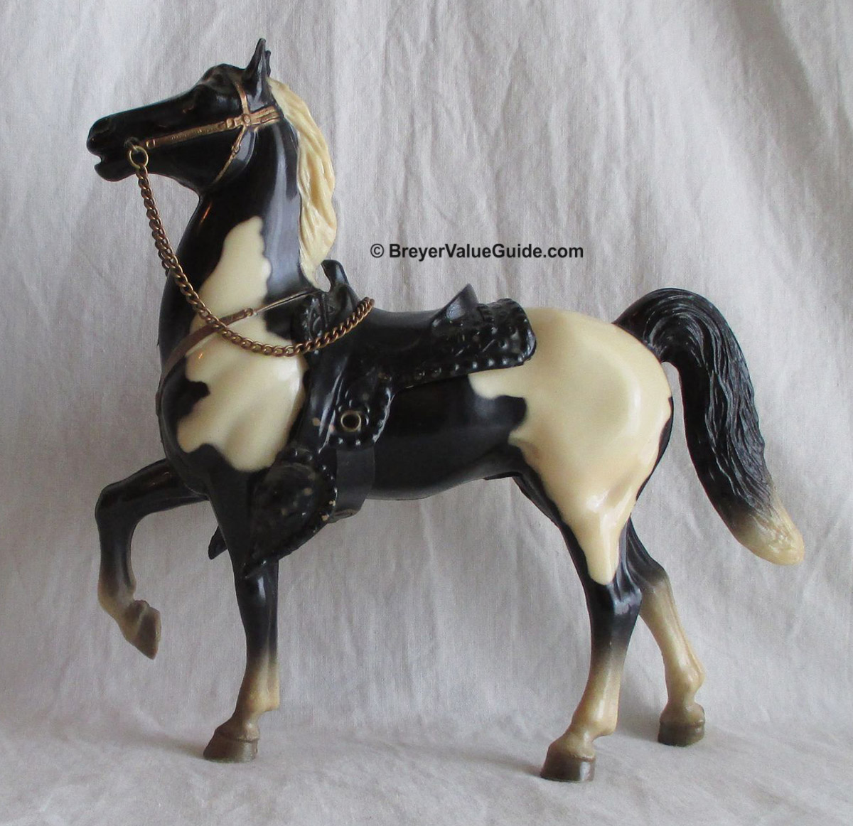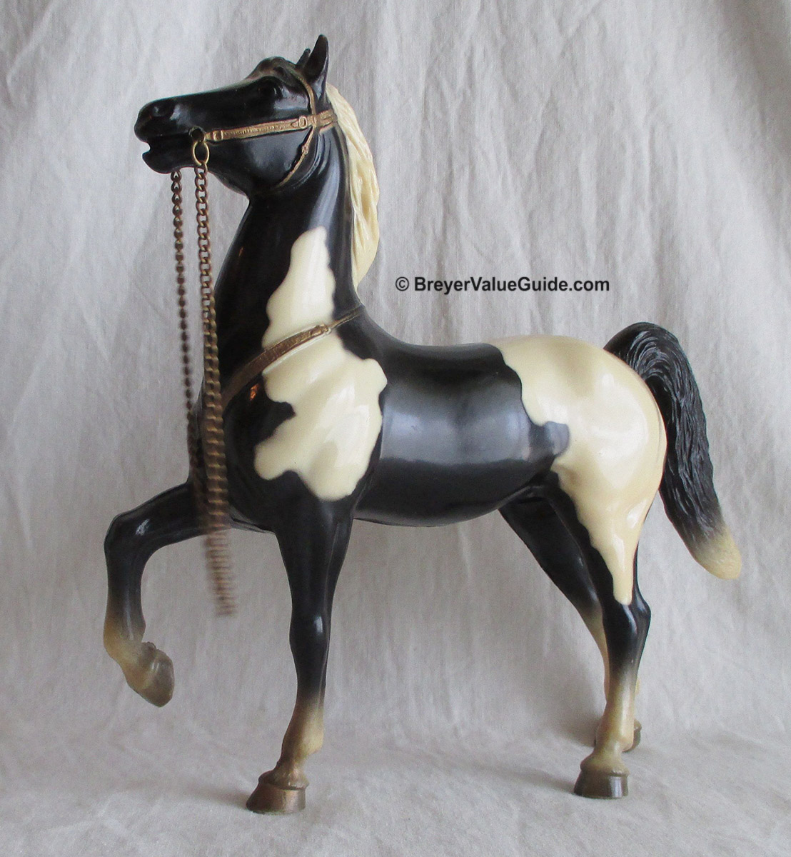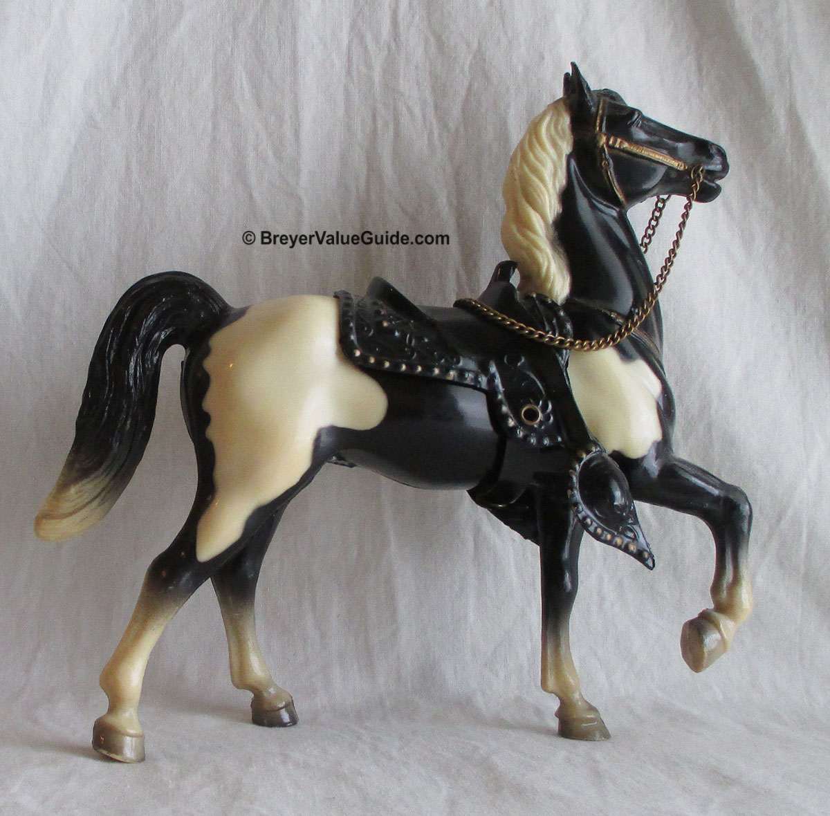 Glossy black pinto; bald face; 4 socks; grey hooves; gold painted on tack; black Western or brown English saddle