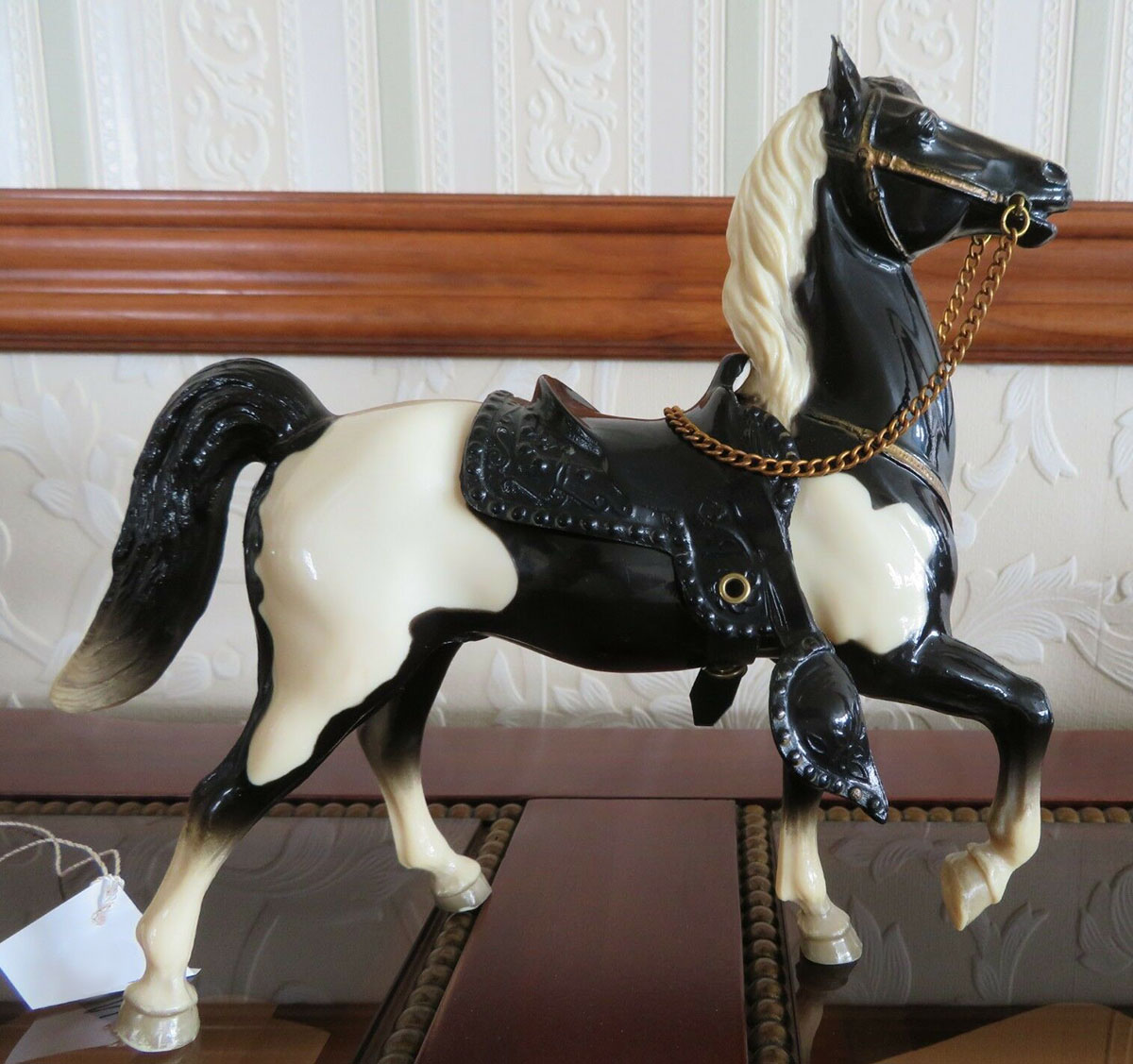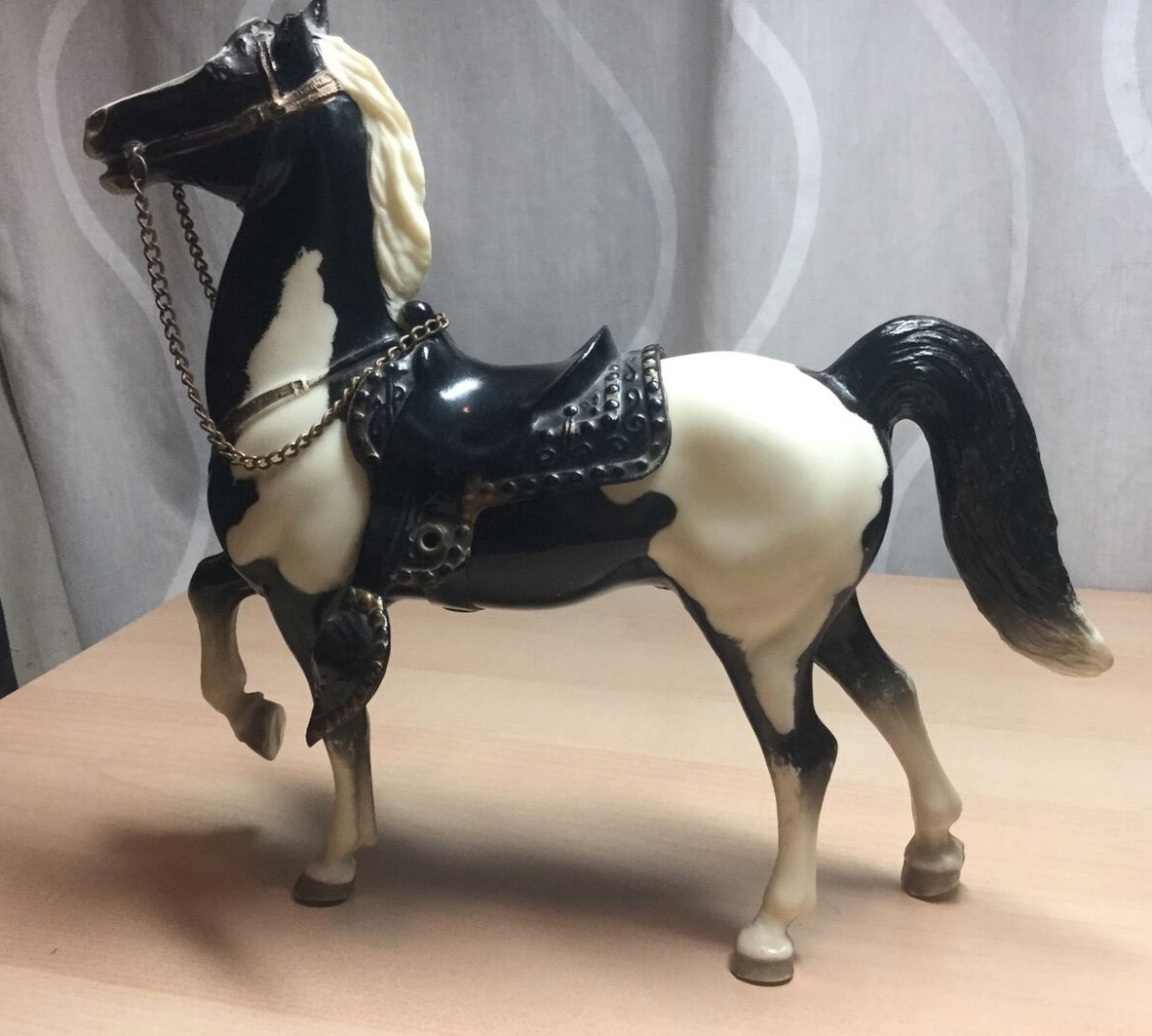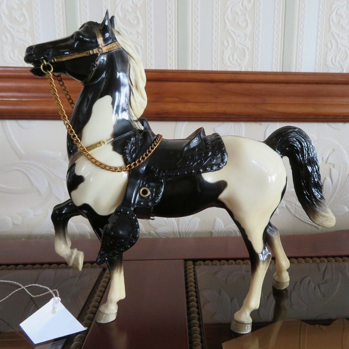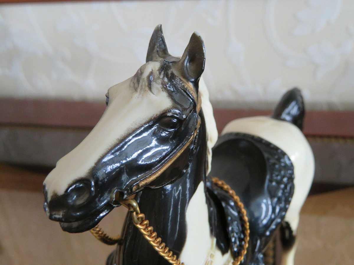 Glossy black pinto; bald face; 4 socks; grey hooves; gold painted on tack; black Western or brown English saddle