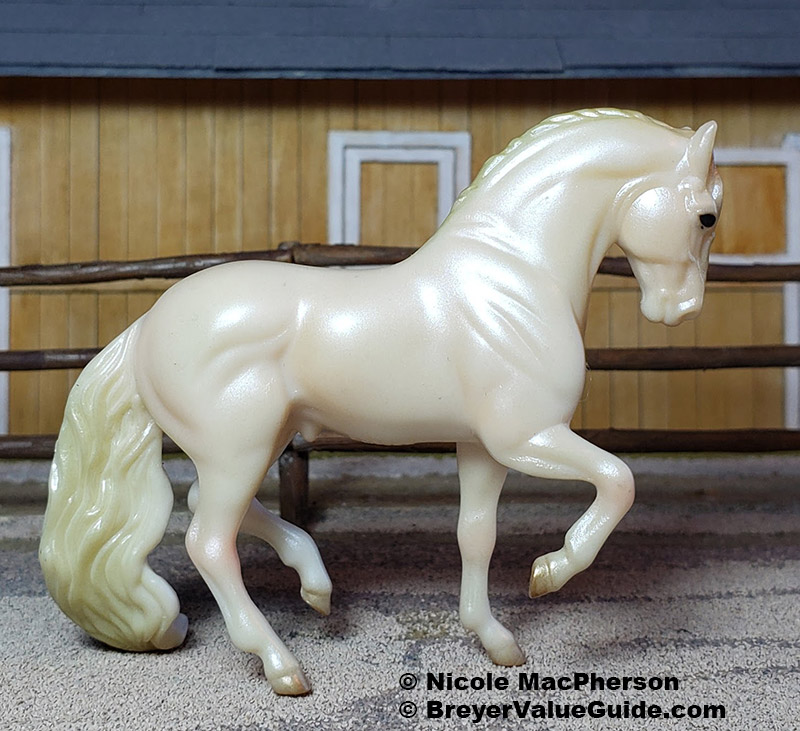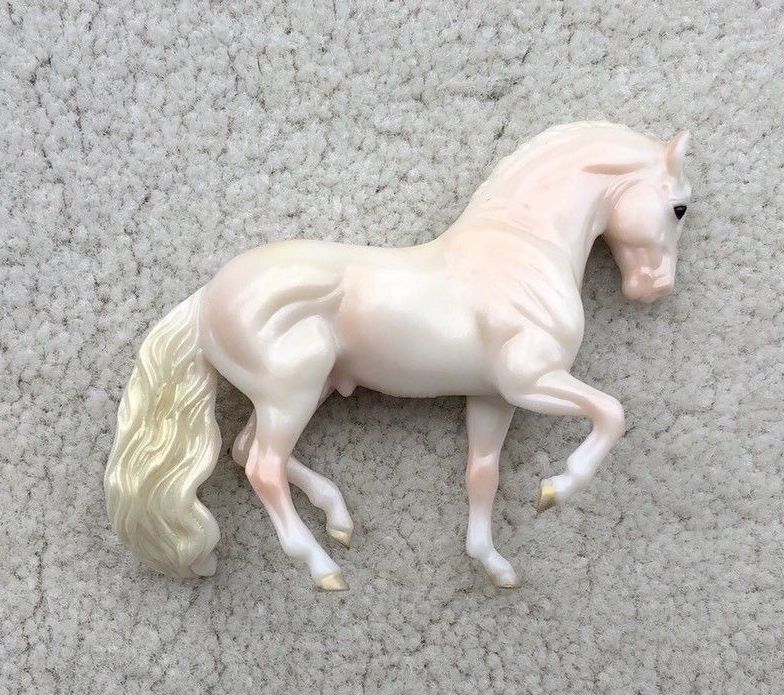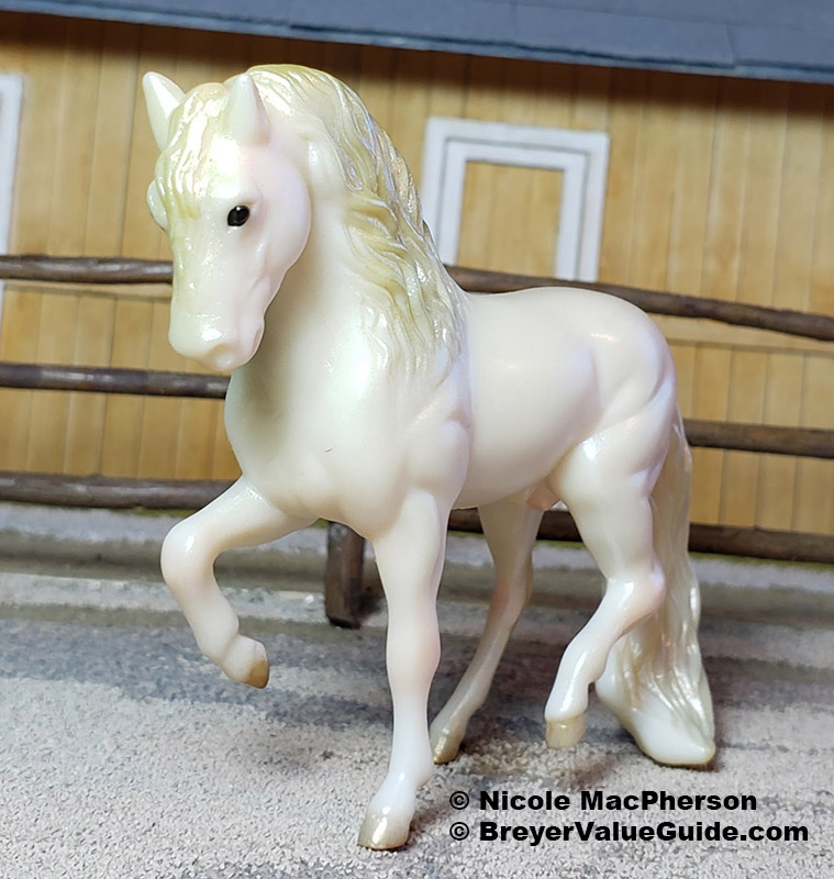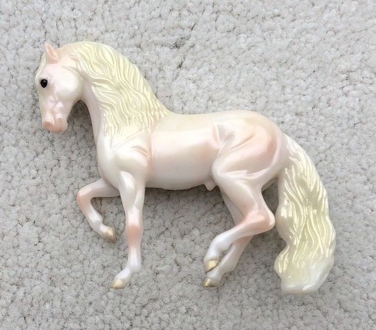 Pearlescent light pink with light gold mane and tail; gold hooves
