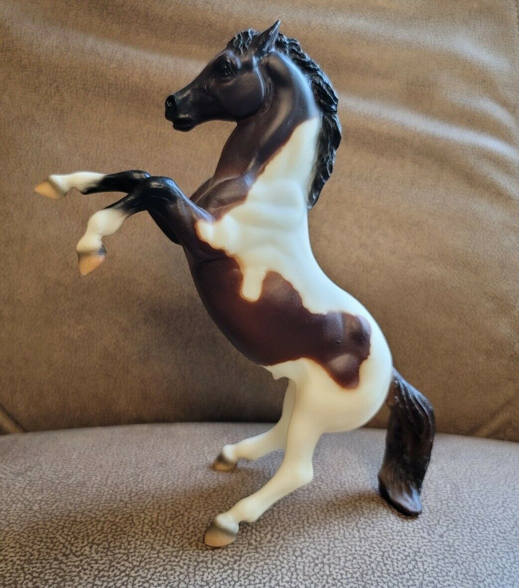 Matte dark bay pinto; black points and socks on forelegs; white hind legs; natural hooves