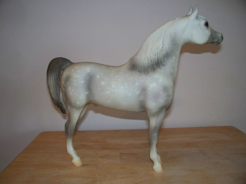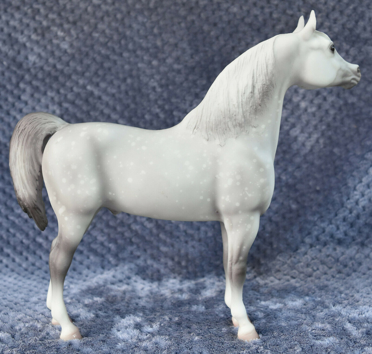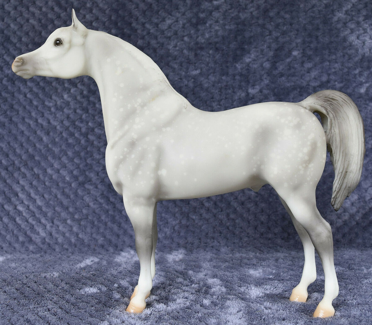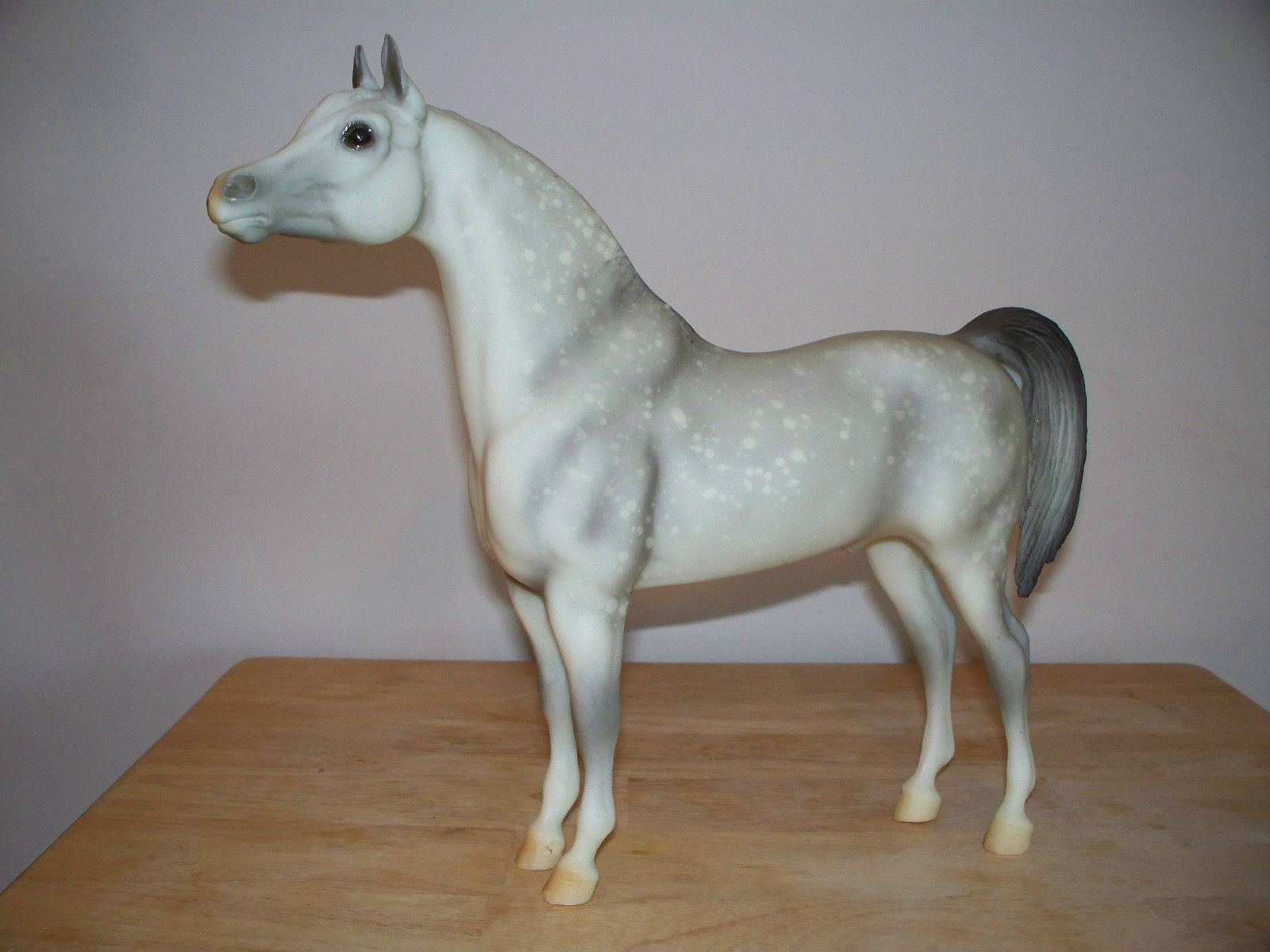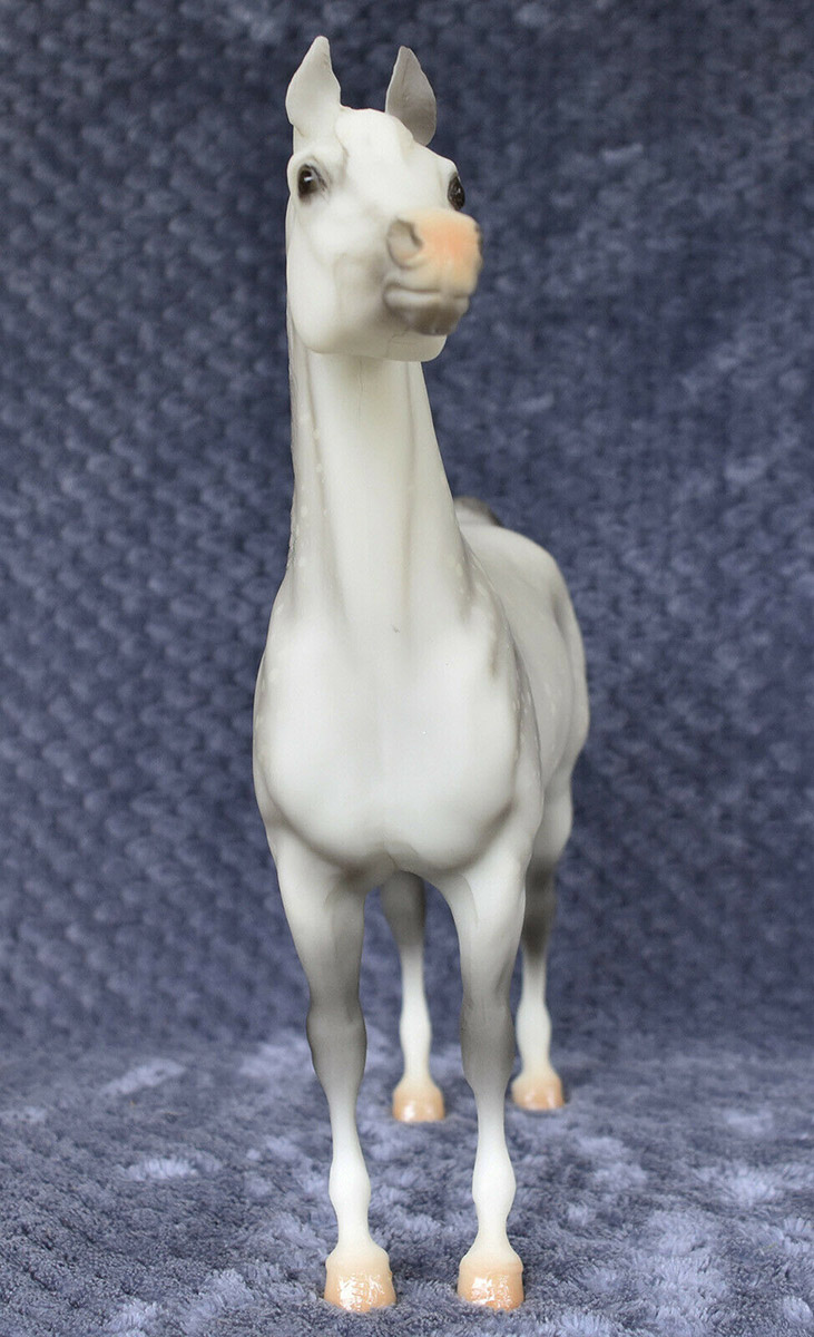 Matte light grey; resist dapples; grey muscle shading; pink muzzle; 4 socks