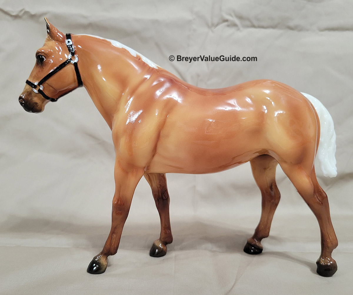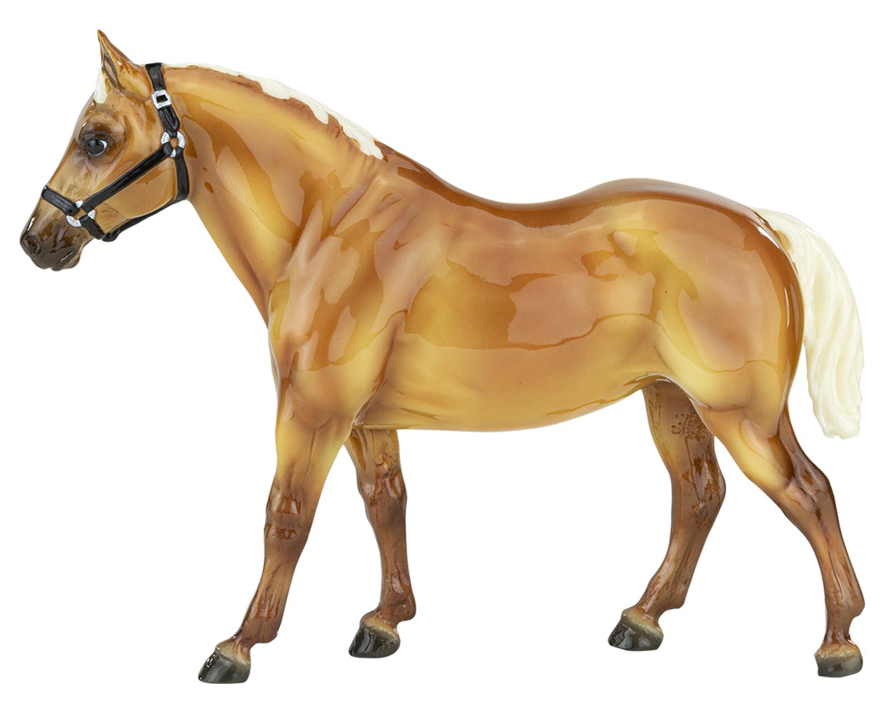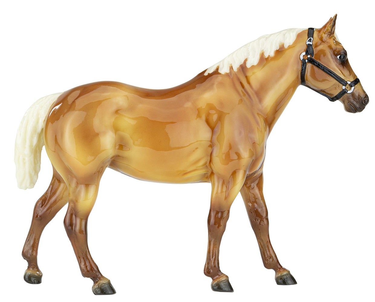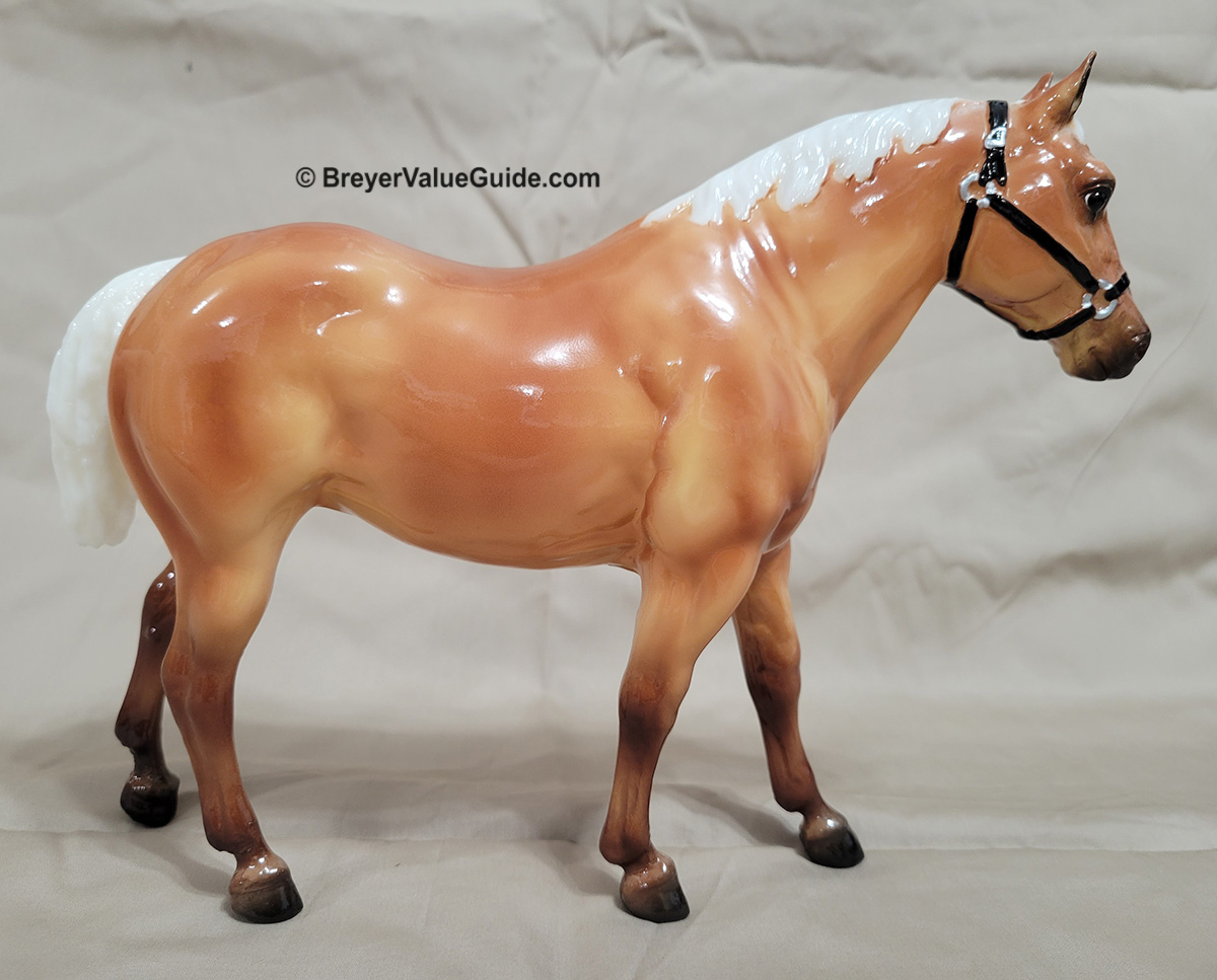 Glossy shaded palomino, white mane and tail, solid face, black halter with silver hardware Issue price: $45