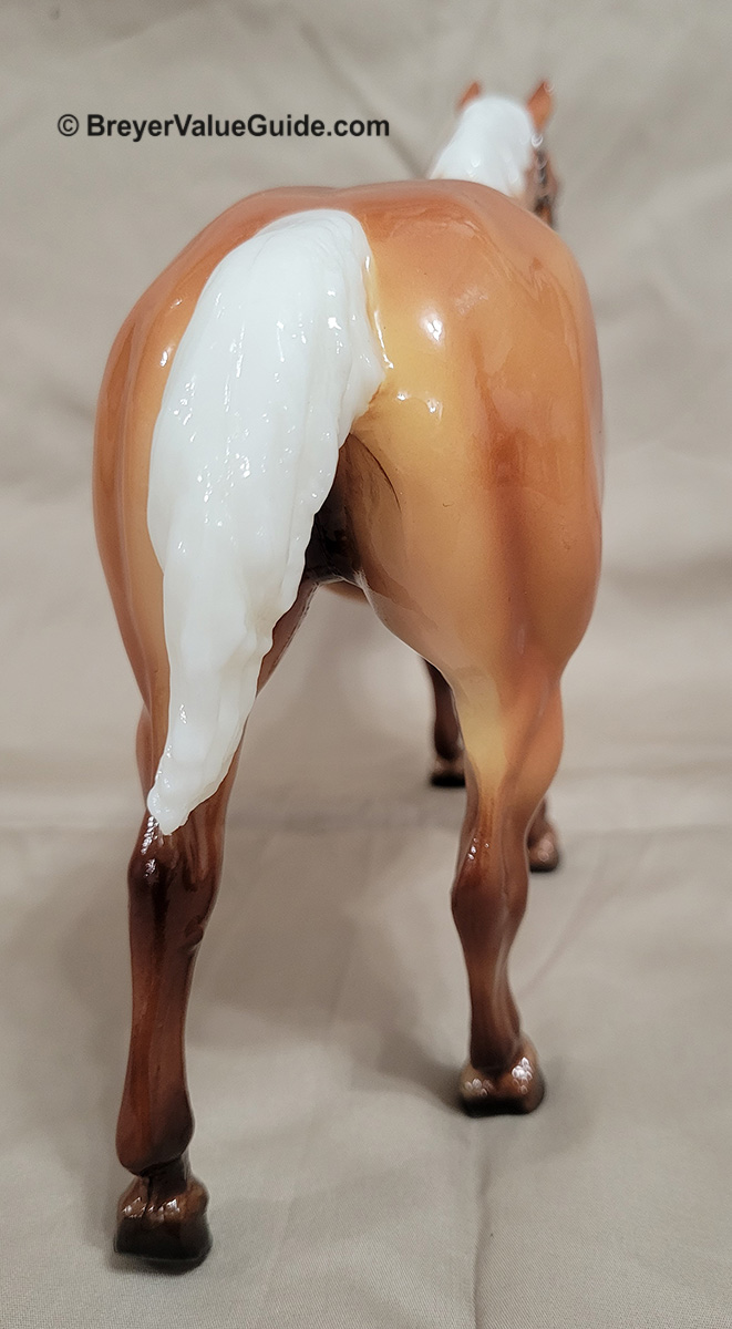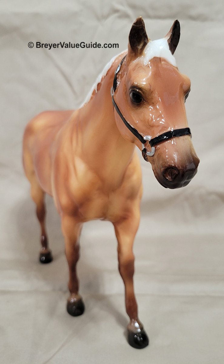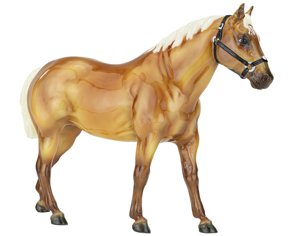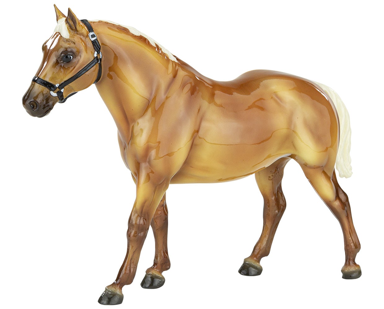 Glossy shaded palomino, white mane and tail, solid face, black halter with silver hardware Issue price: $45