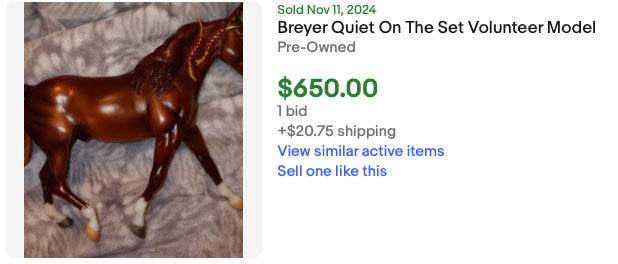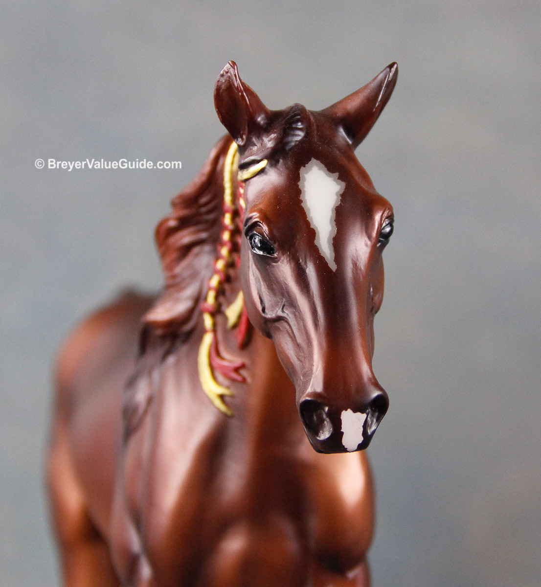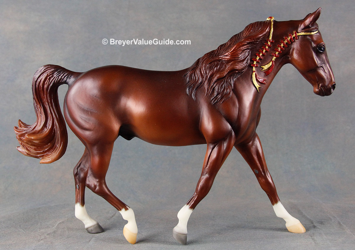 Semigloss metallic chestnut; large star; snip; 4 socks; gold and red ribbons; BreyerFest Volunteer SR; 1/150
