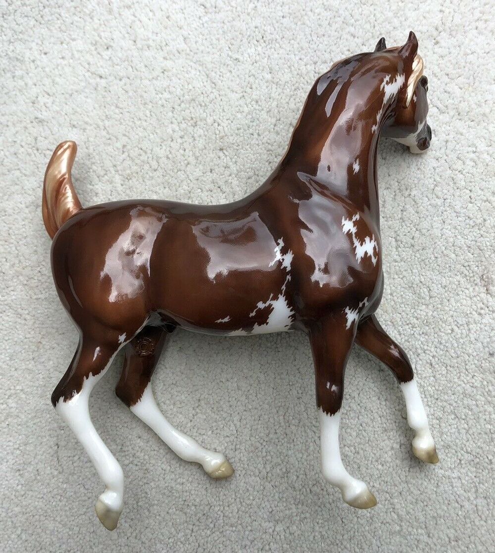 Glossy dark chestnut pinto; sabino markings; wide blaze; 4 stockings; red rope halter with tassels; blue ribbon sticker; carrying case box; Vintage Club SR; 1/500