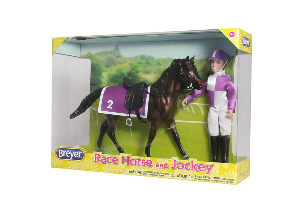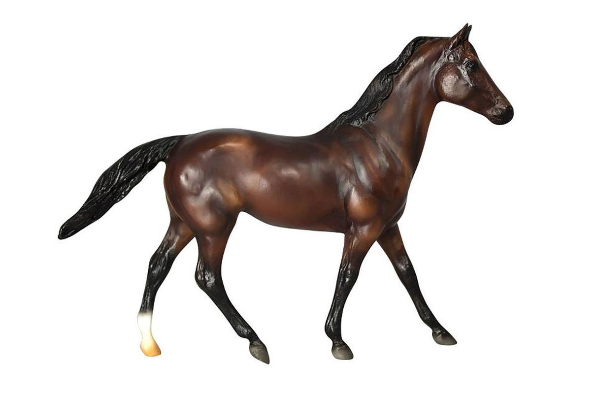 Matte bay; solid face, 1 hind sock – with Jockey doll and English tack