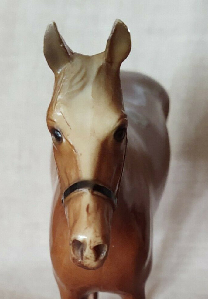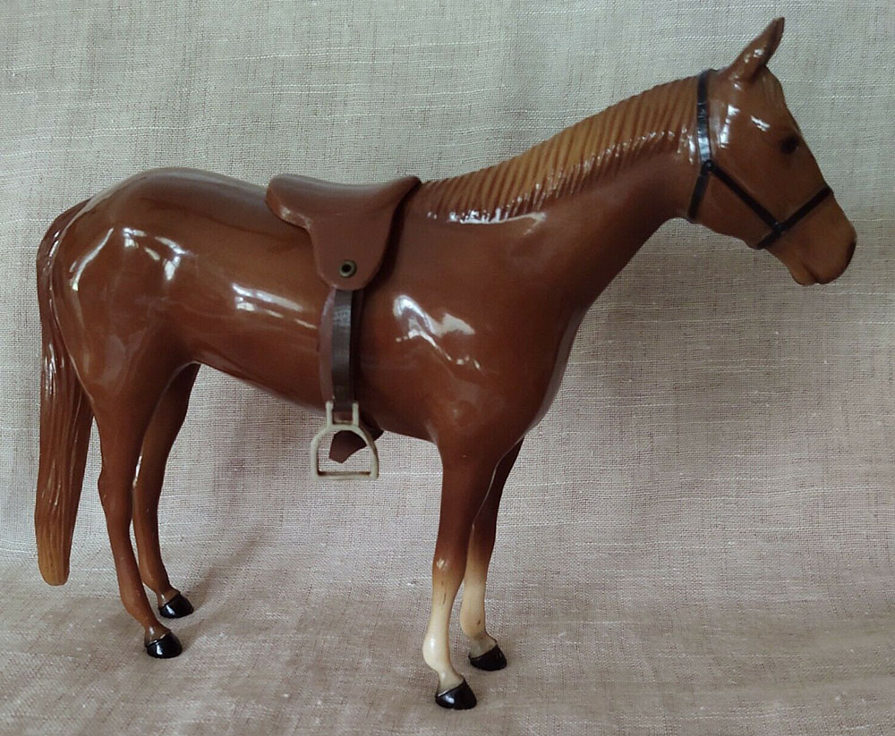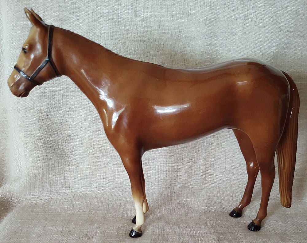 Glossy chestnut; bald face; various stockings. Some included hard plastic saddle