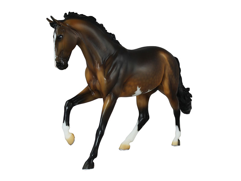 Matte dark/sooty buckskin pinto; splash spot on belly; dapples; black mane and tail; blaze with snip; 3 socks; painted horseshoes; BreyerFest Raffle SR; 1/26