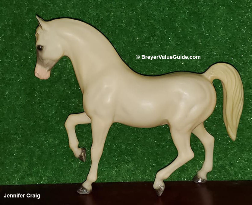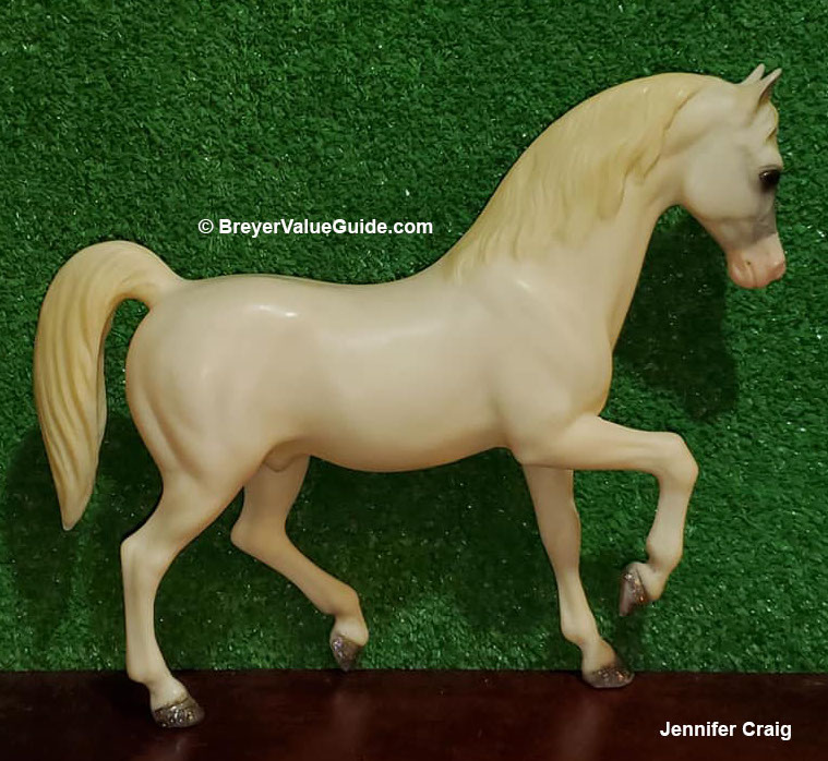 Matte white; soft yellow mane and tail; blaze over muzzle; grey hooves