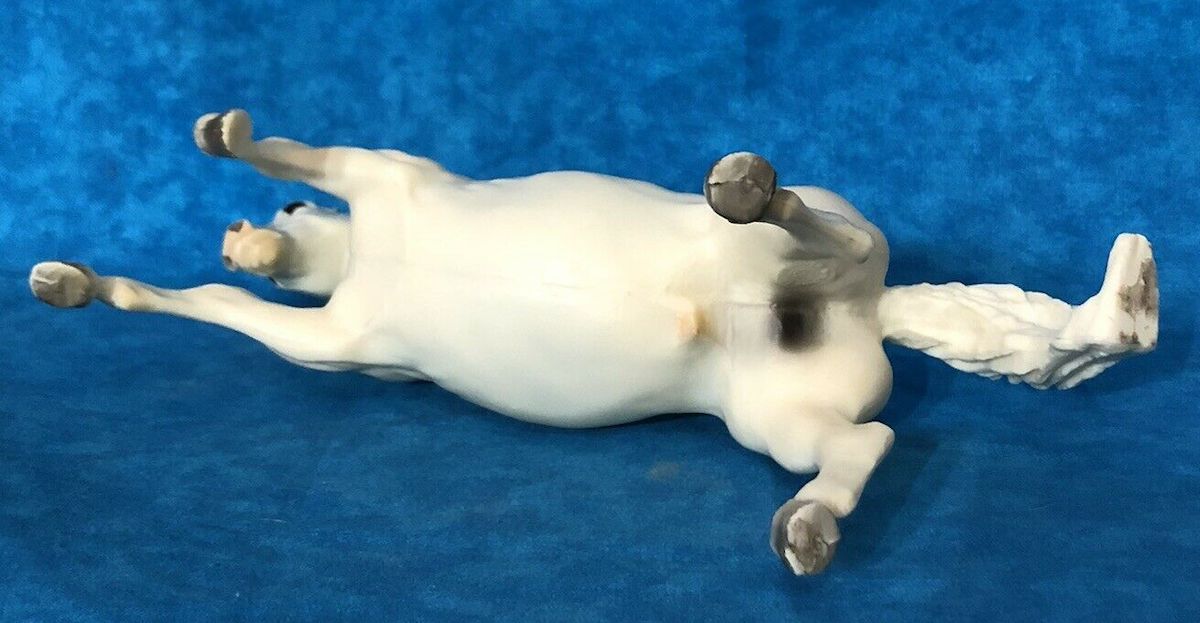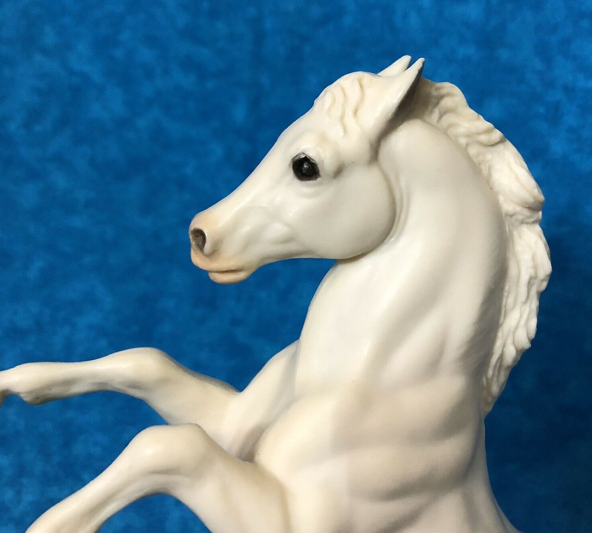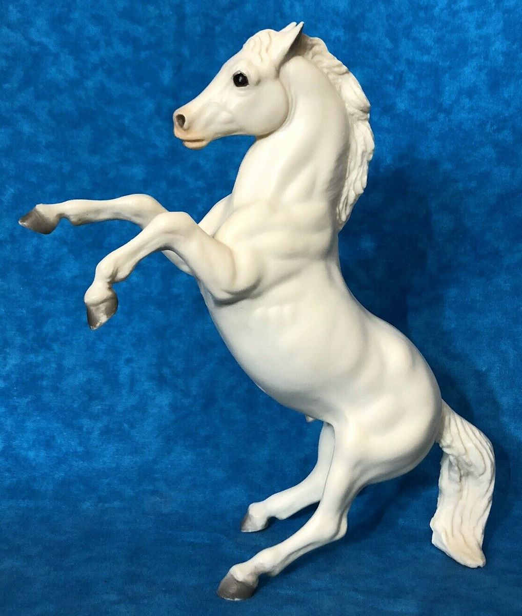 Matte alabaster; shaded pink muzzle; grey hooves; chalky variations known