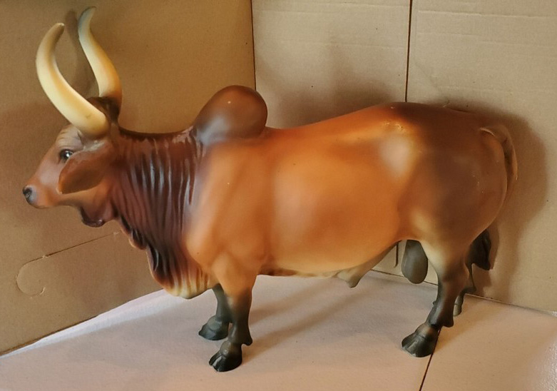 Matte shaded red dun; solid face; dark red neck; grey shaded hindquarters; grey tipped horns