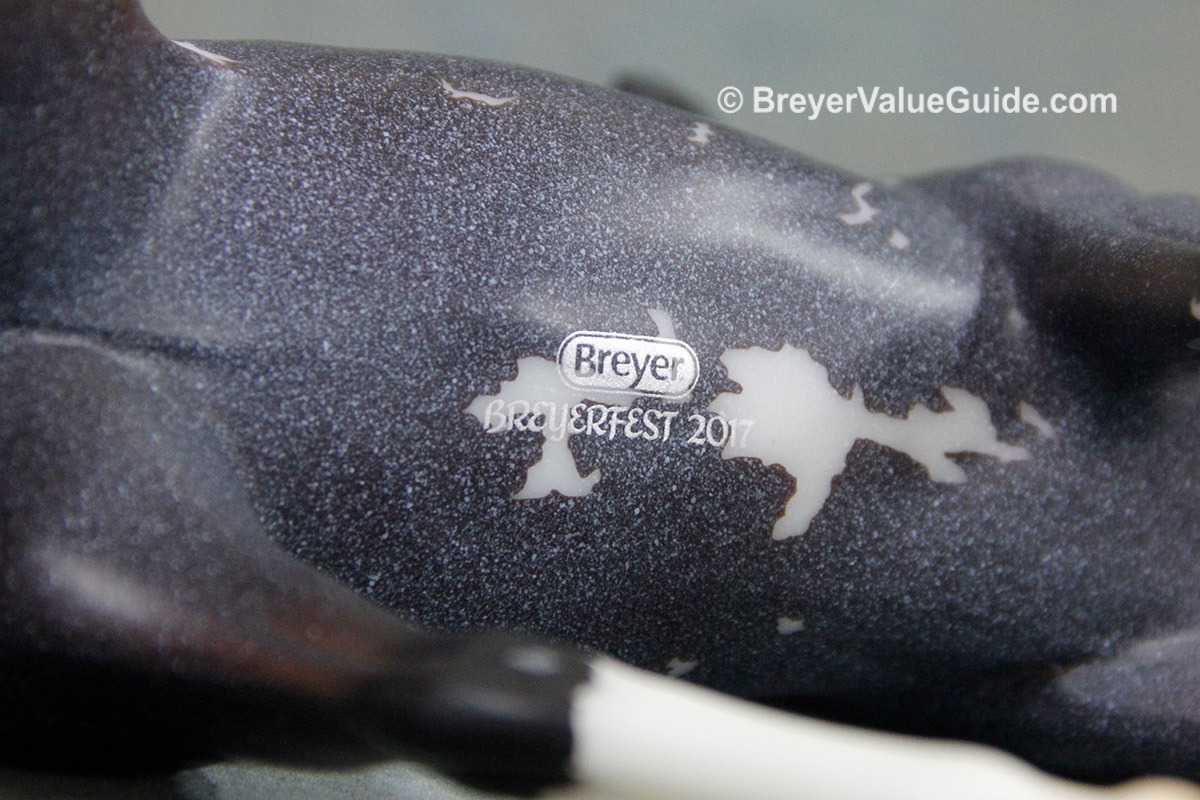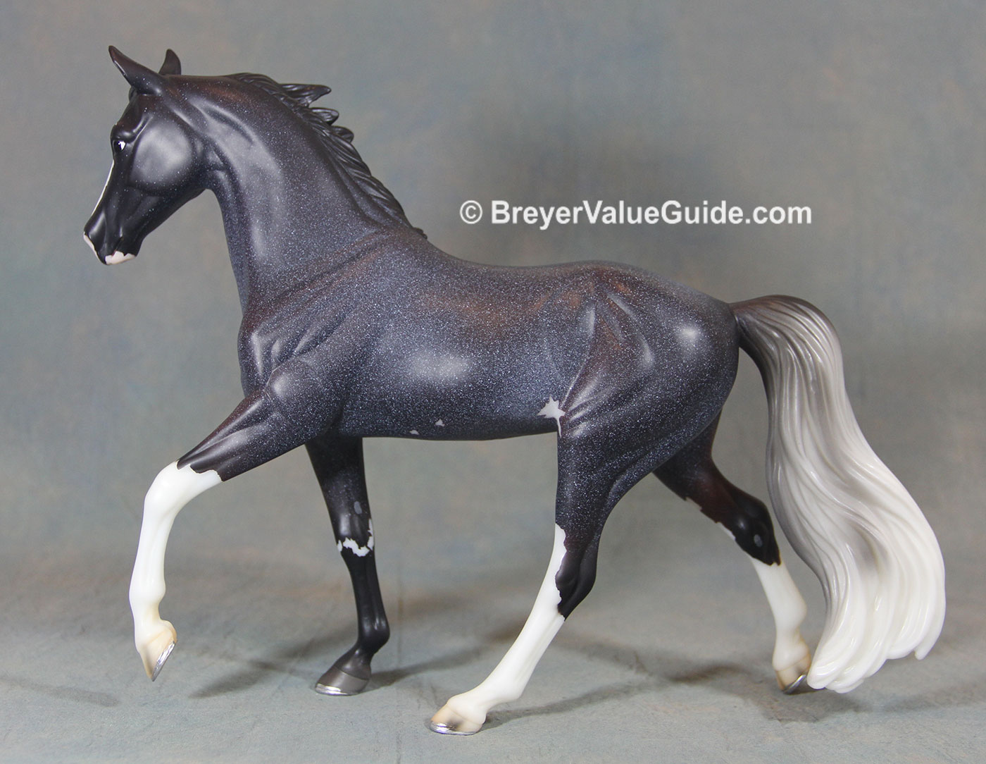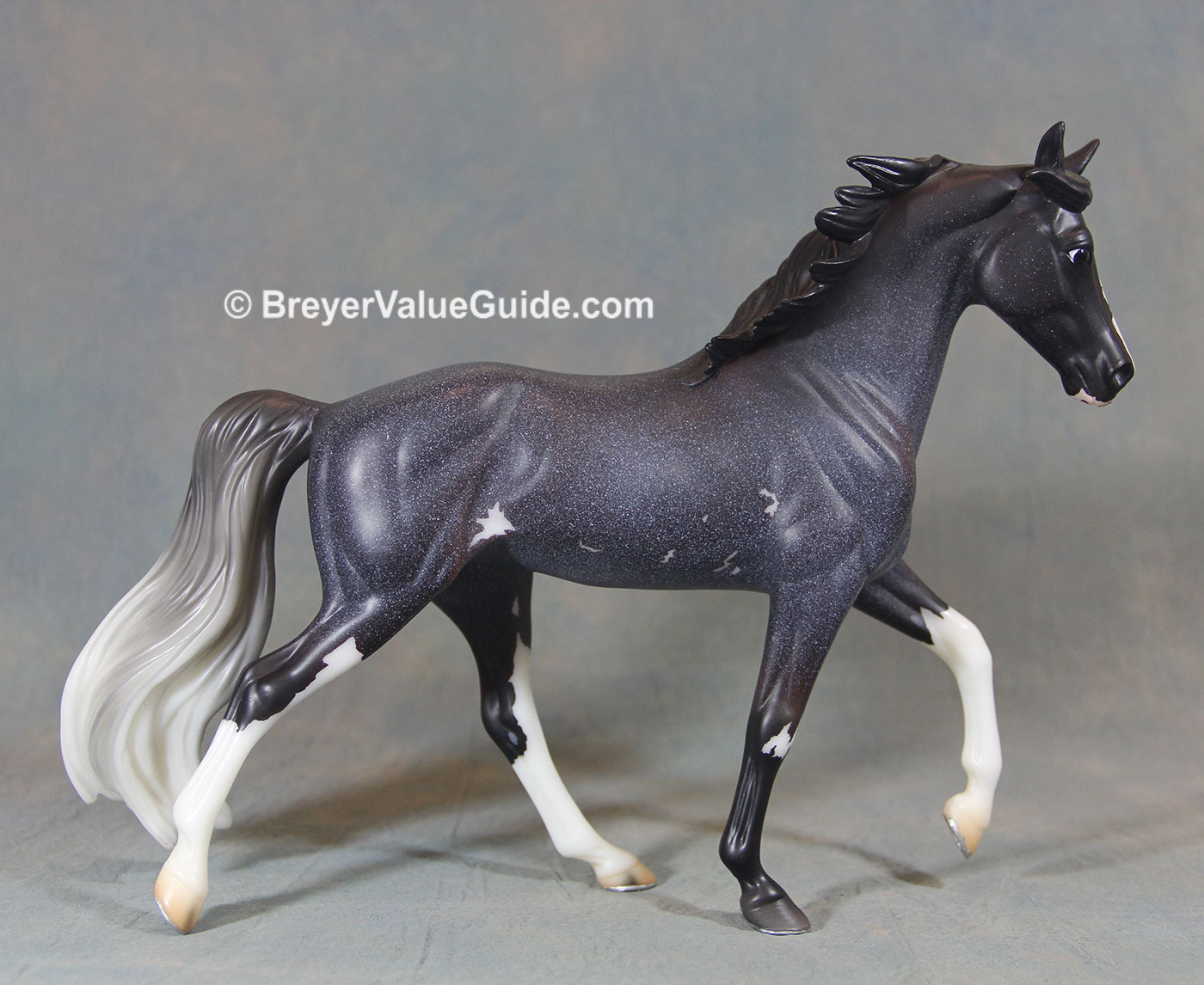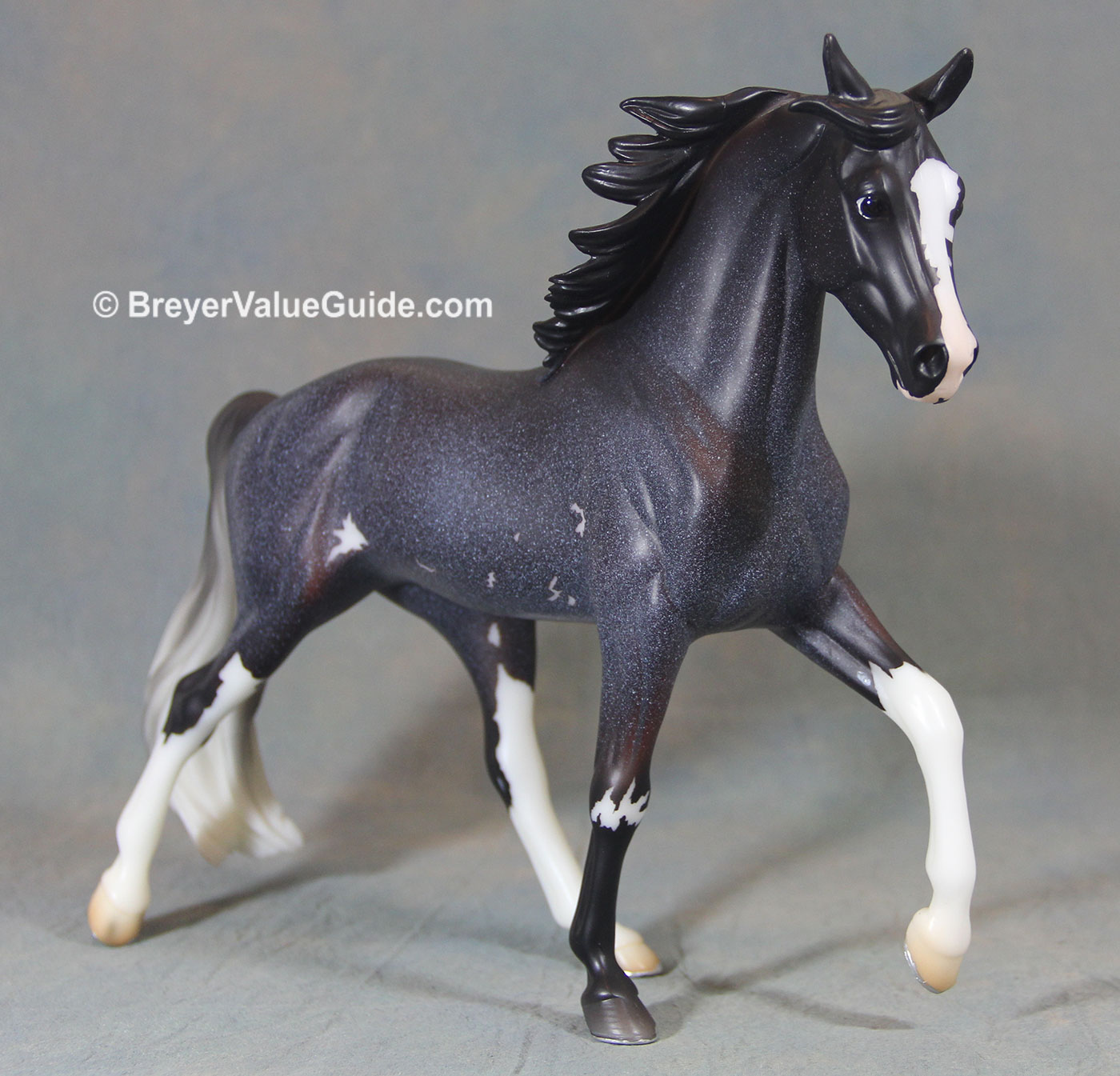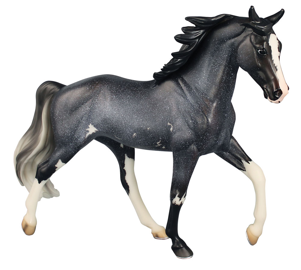 Matte black, roaning, minimal pinto spots, blaze, 3 high whites, painted horseshoes, BreyerFest SR, 1/1000