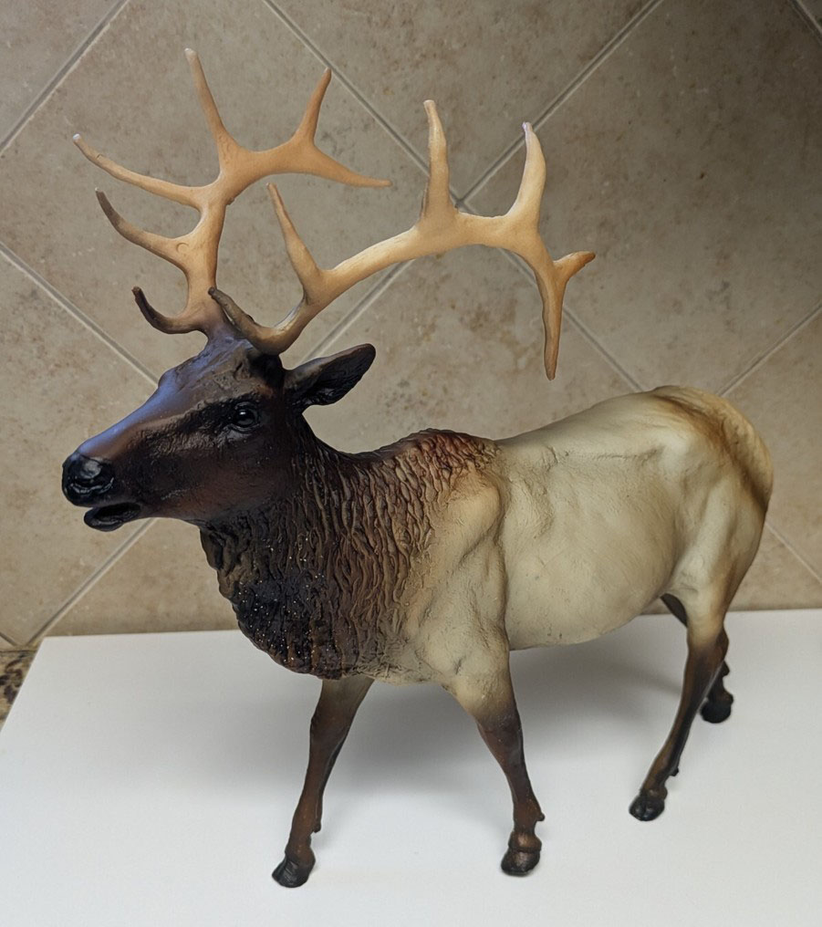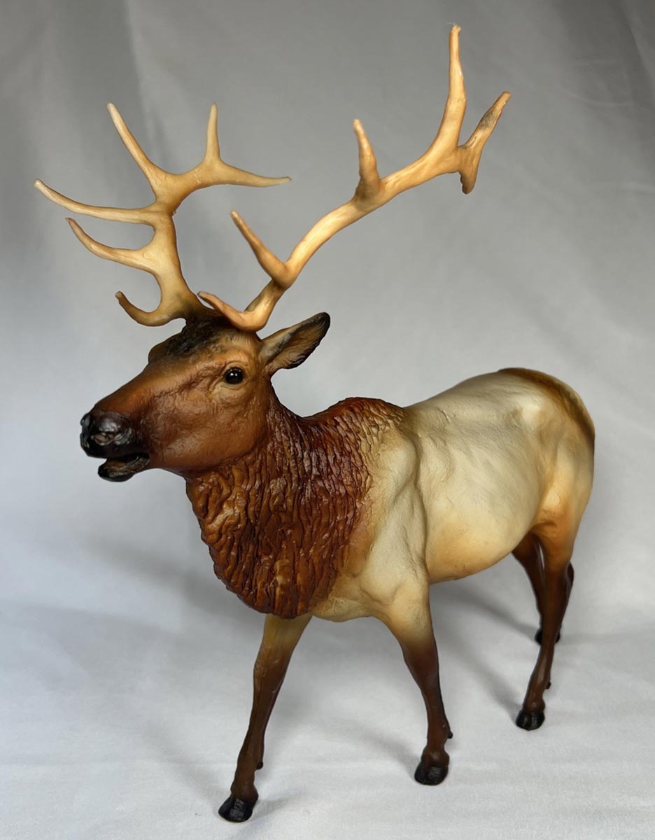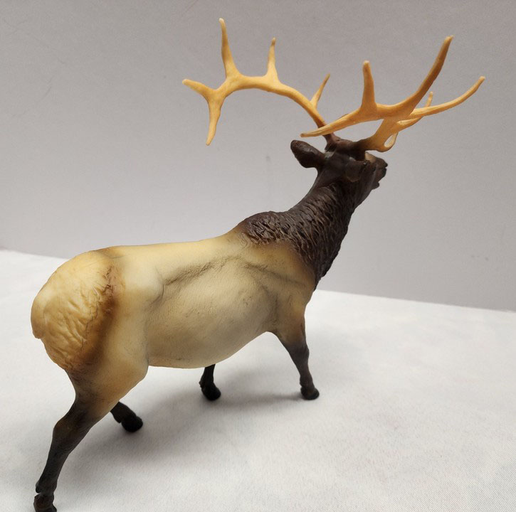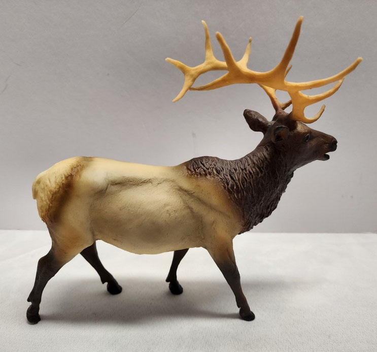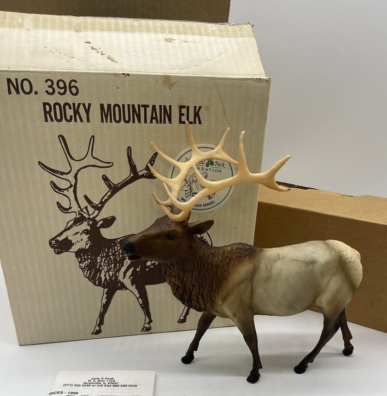 Matte shaded light tan-grey body, dark brown head and neck, dark outline around base of tail, light tan antlers. National Park Federation Wildlife Series (1998, in solid box), Wildlife Series, then North American Wildlife series (1999-2005).