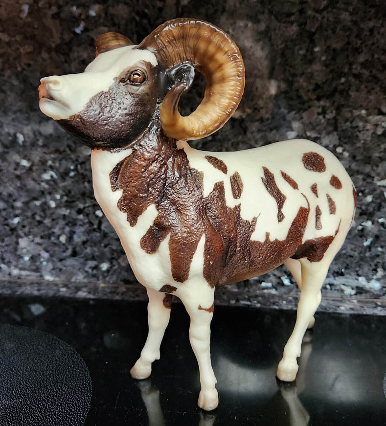Matte spotted brown and white, brown and tan striped horns. Web SR, 1/40