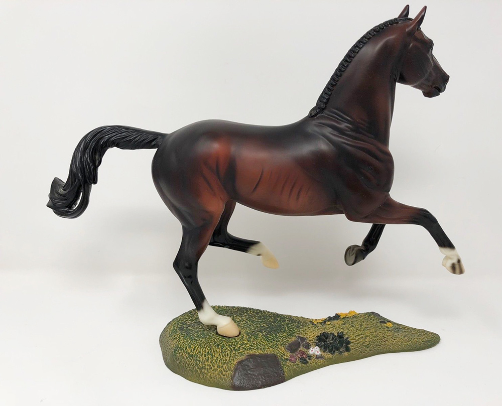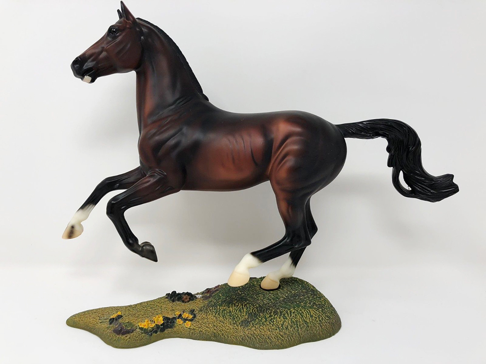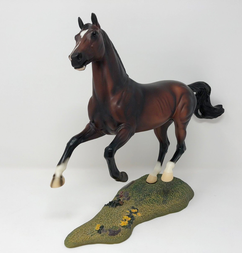 Matte dark bay; star, stripe, chin spot; 3 socks; green base; USET SR; 1/750