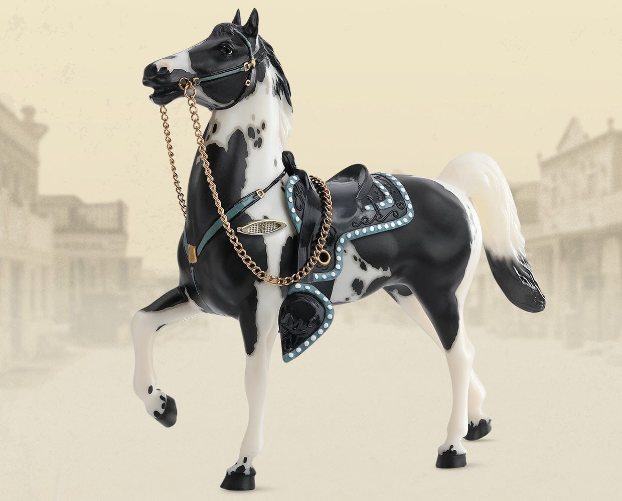 Music Box. Matte black pinto, mapped markings, dark hooves with ermine spots, bridle and chest collar black with turquoise, black snap on saddle with turquoise and white trim, Vintage Club SR, 1/1000