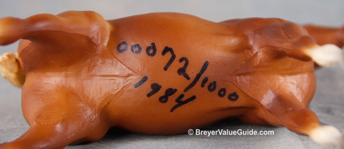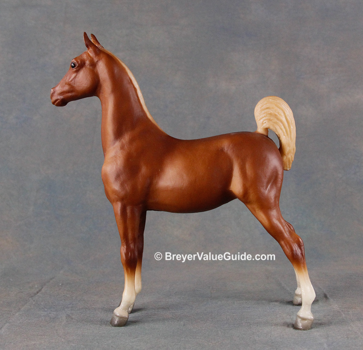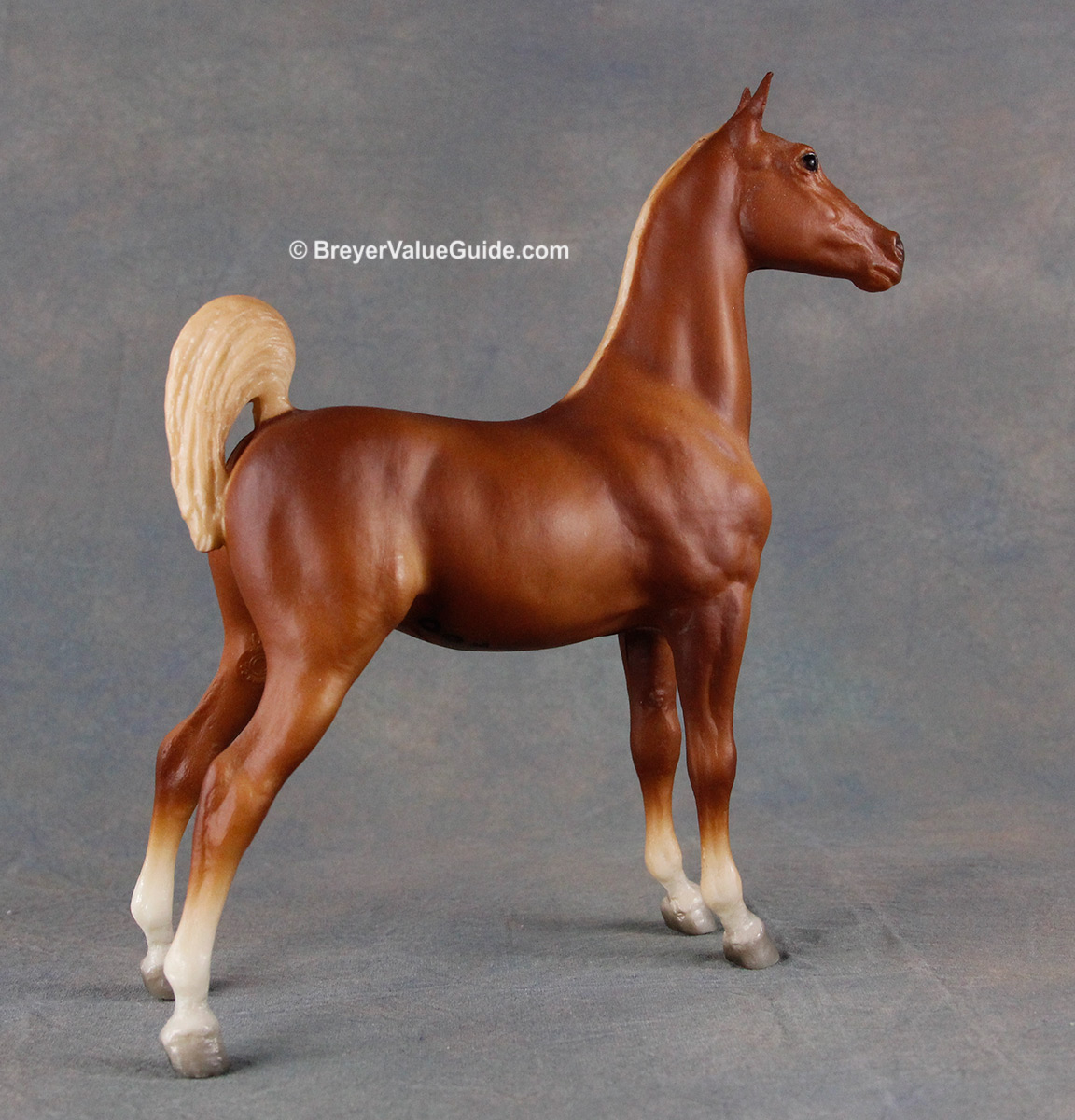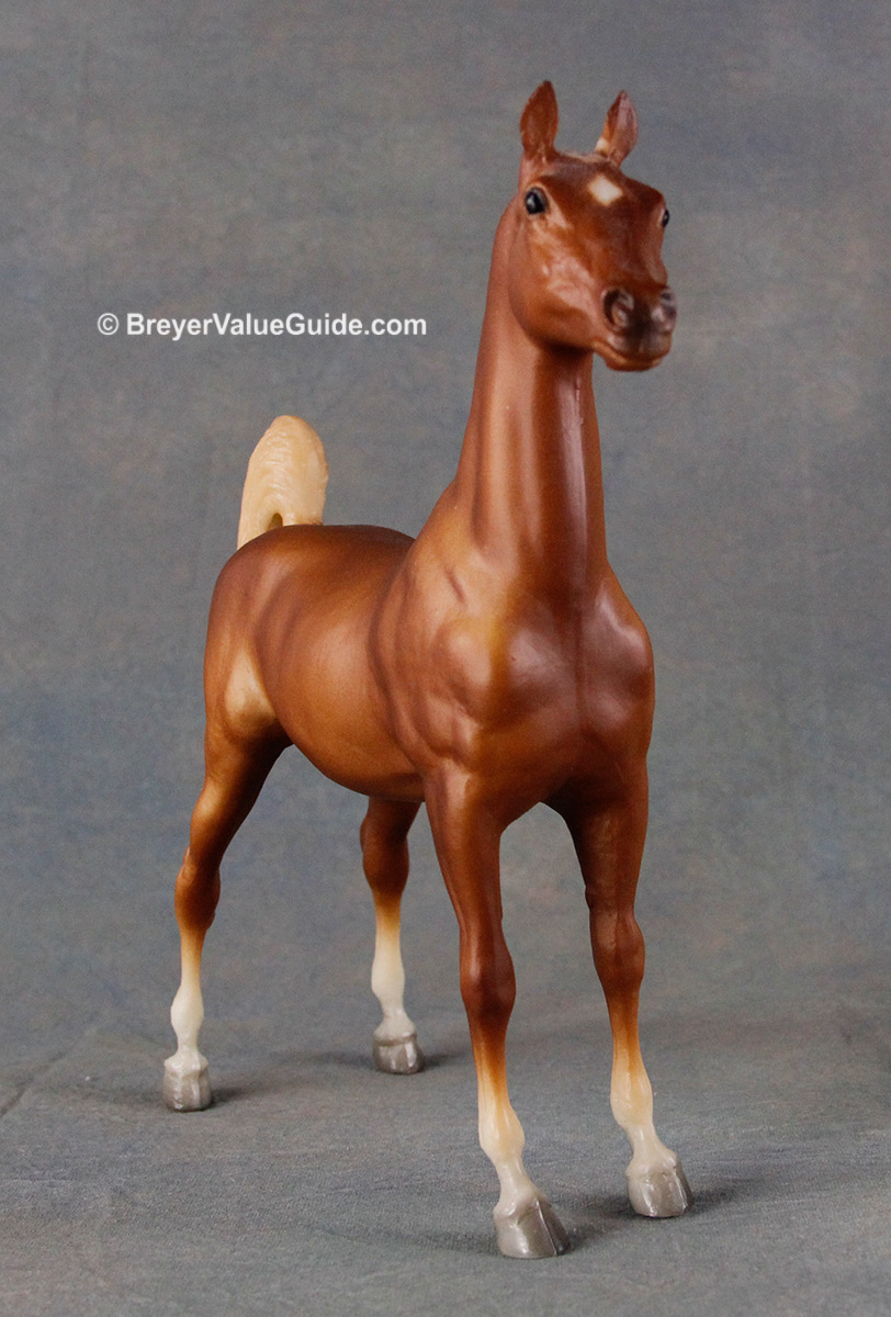 Matte sorrel; diamond star; 4 socks; grey hooves; tail tip is attached to buttock; hand numbered on belly; JAH SR; 1/1000