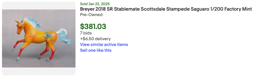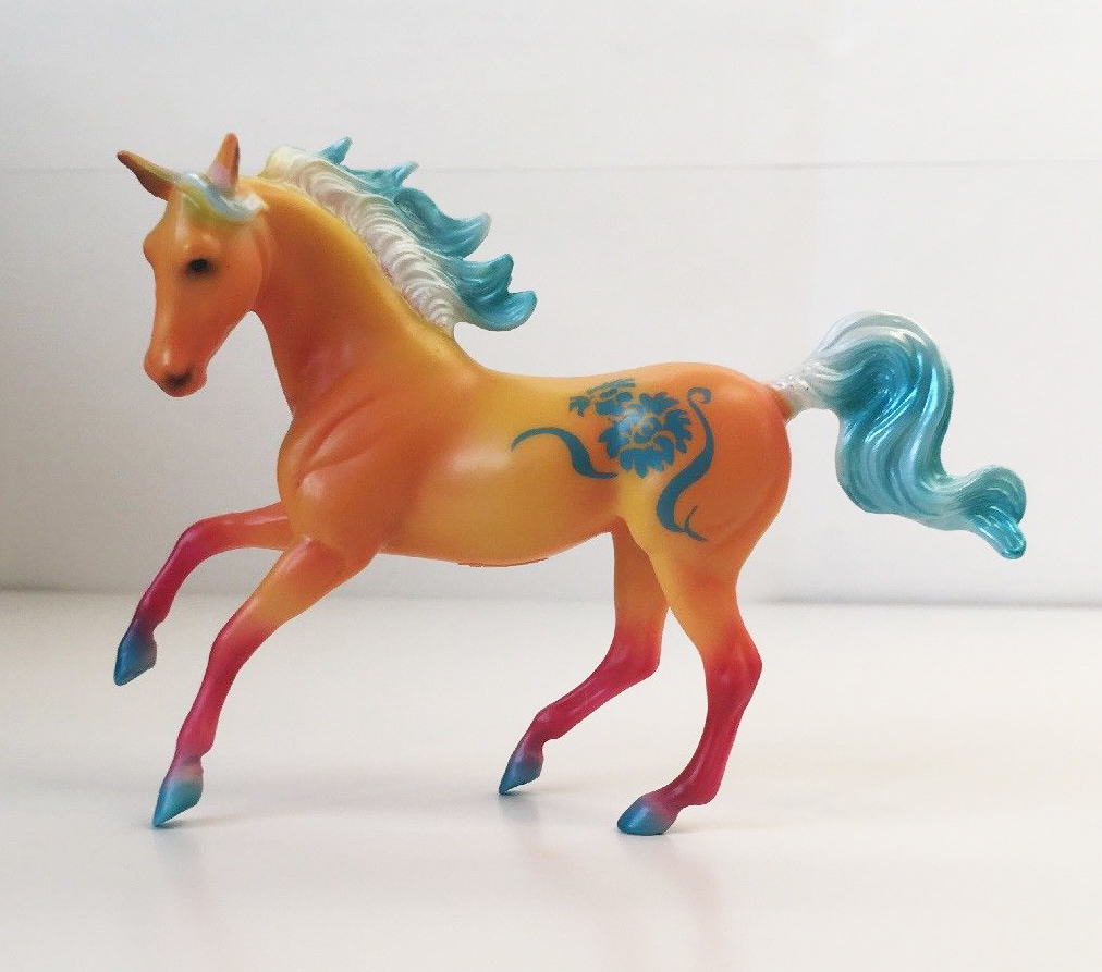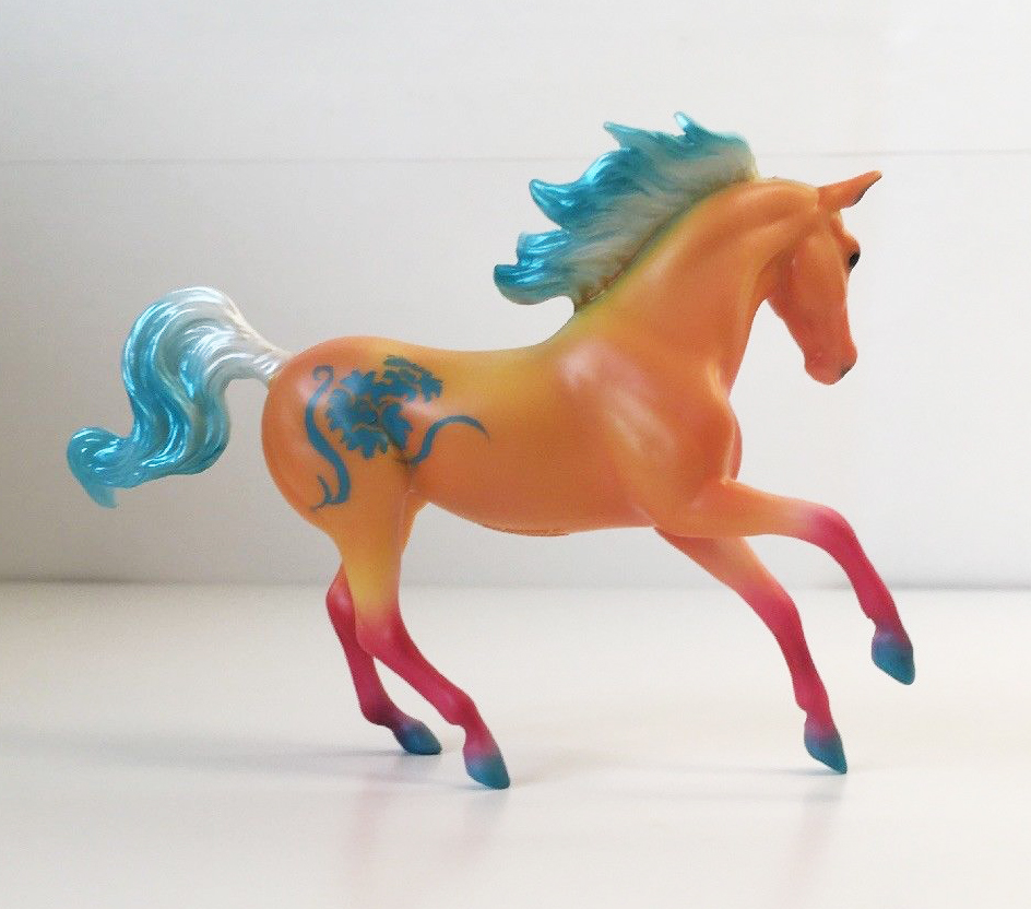 Matte decorator with yellow and orange shaded body; pink legs; blue shaded mane, tail and hooves. Blue floral design on hips. Scottsdale Stampede SR; 1/200