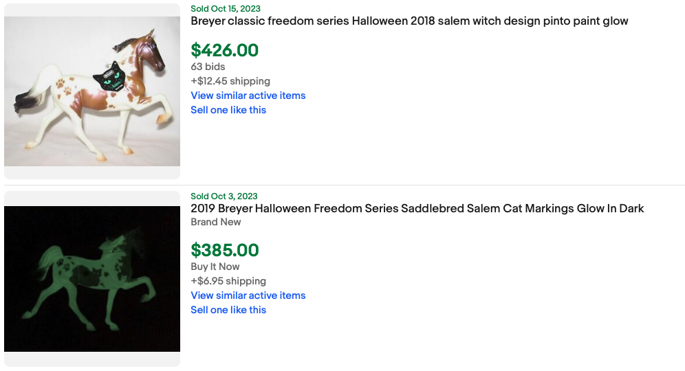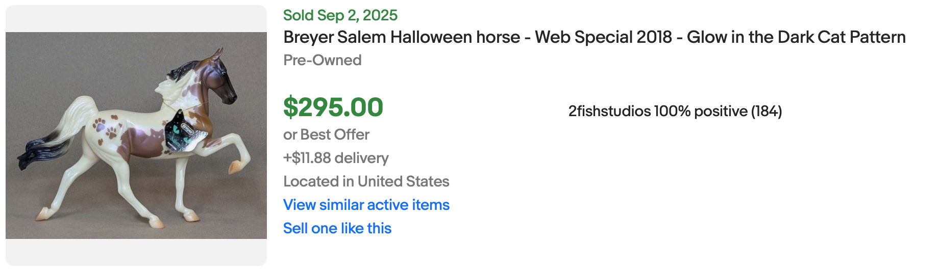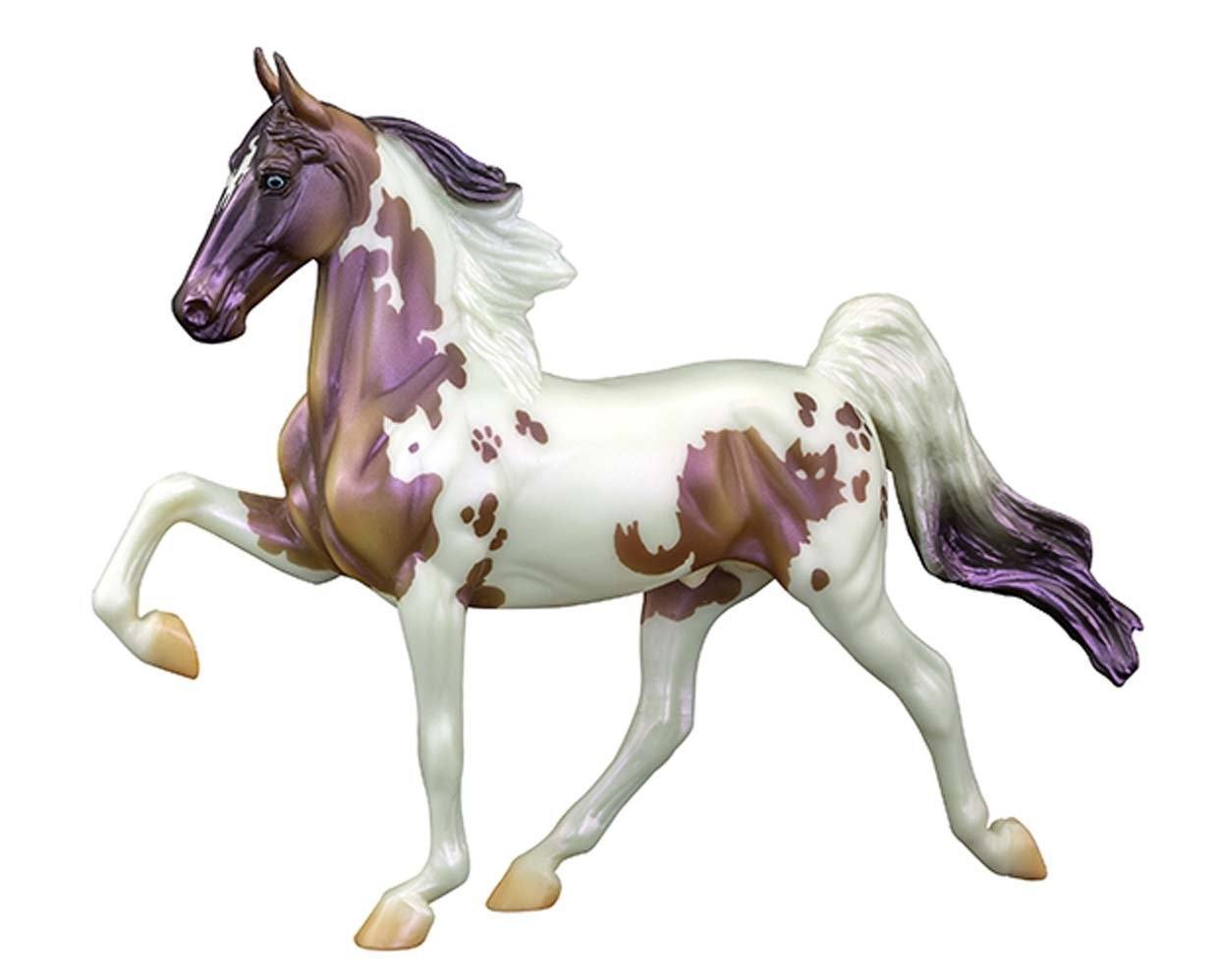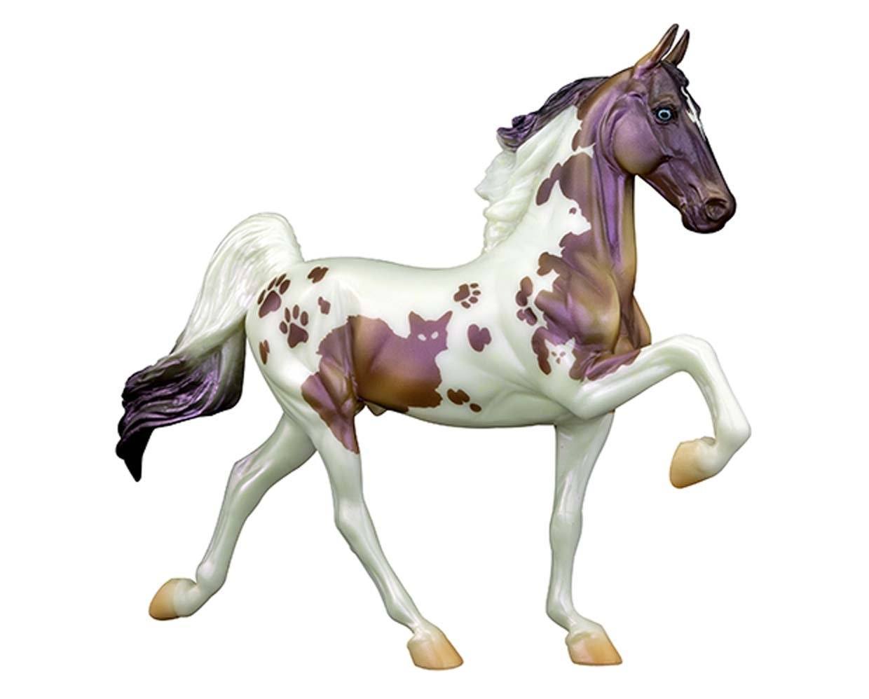 “Salem was designed by artist Christine Jordan, and sports a shaded grullo pinto coat with interference purple and cat track markings. Take a closer look – Salem’s coat features hidden cats and paw prints! For added fun, turn off the lights to see his white markings glow.”