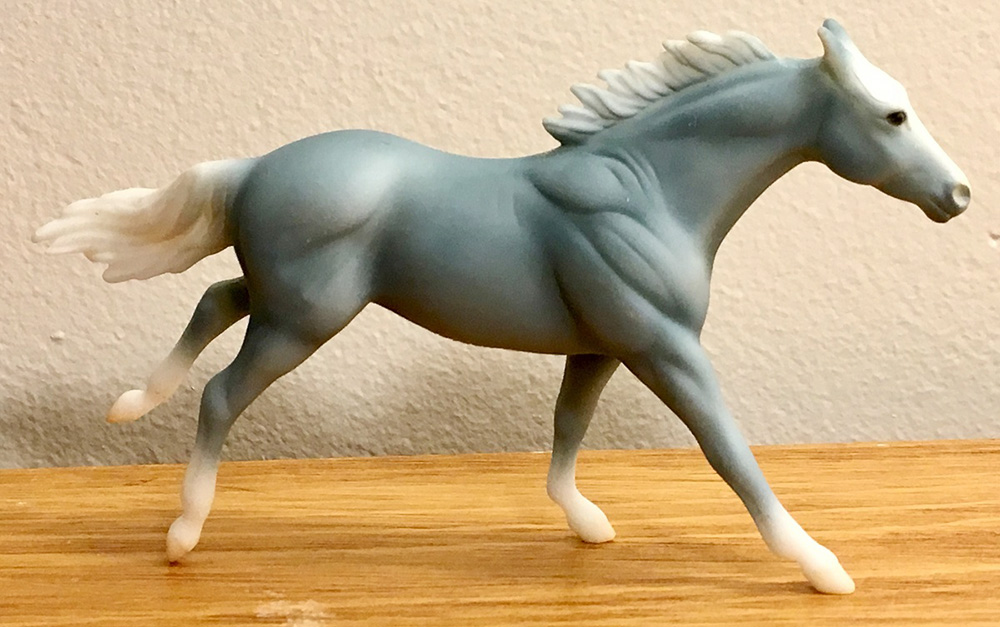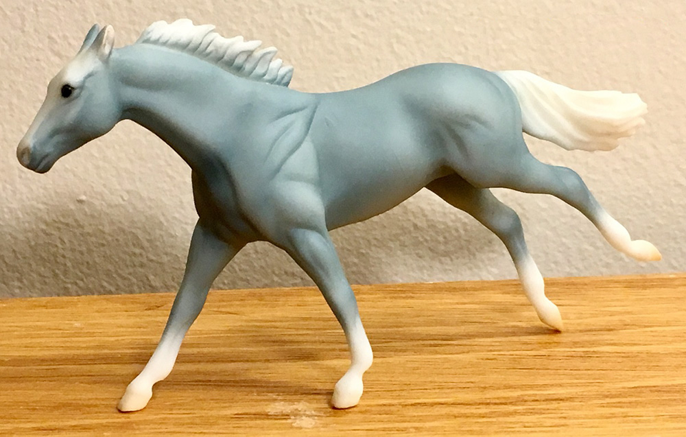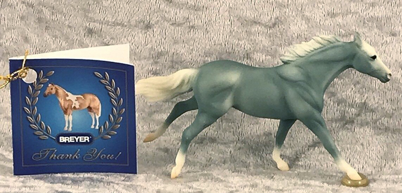 Matte Wedgewood blue, bald face, 4 socks, white mane and tail, with hangtag, given to Breyer Sales Reps Value based on 2022 sold auction price.