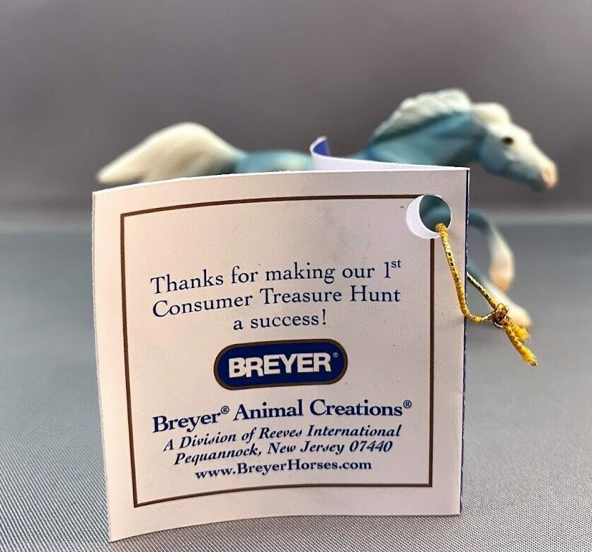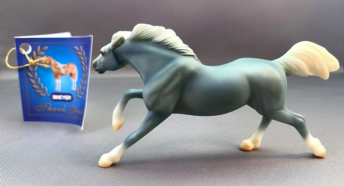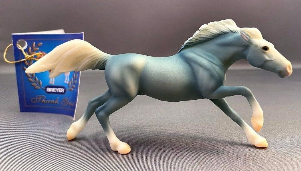 Matte wedgwood blue, bald face, white mane and tail, 4 socks, pink muzzle and hooves, with hangtag; Breyer Sales Rep Gift, unknown quantity made Value based on 2024 sold auction price.
