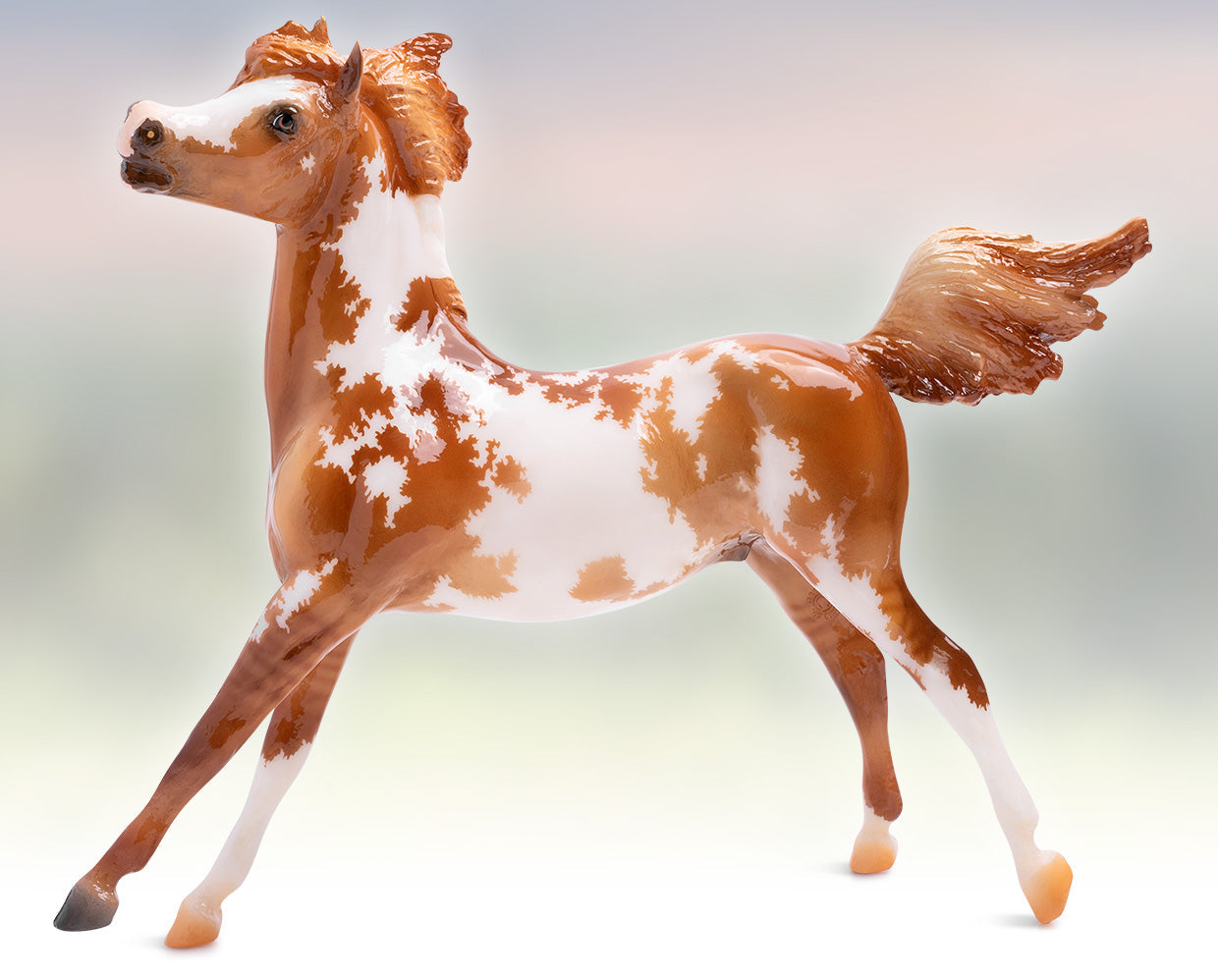 Glossy red dun pinto, wide blaze over muzzle, 2 stockings, 1 low sock, leg barring, Vintage Club SR, 1/750