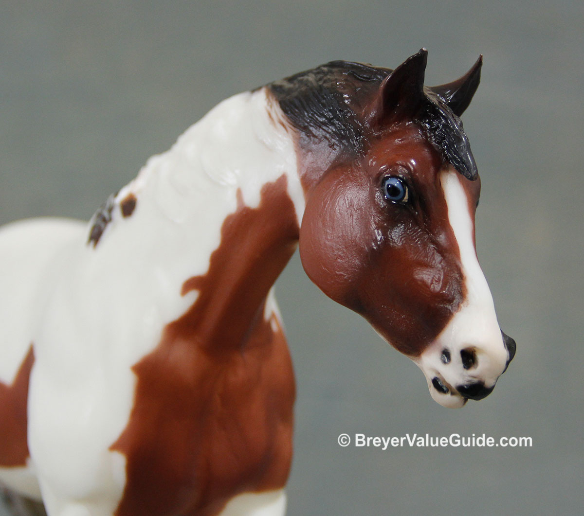 Matte bay pinto; added mane and tail feathers, blaze with white muzzle, black spots on muzzle, 1 blue eye, 1 brown and blue eye