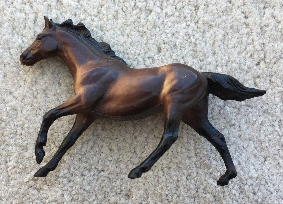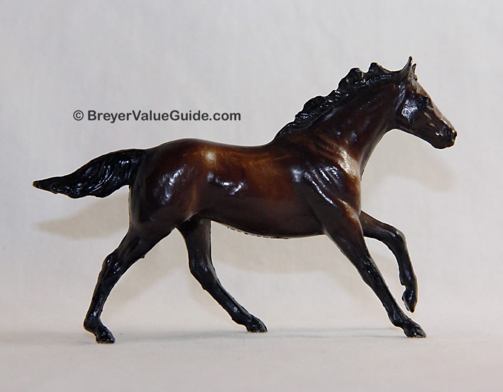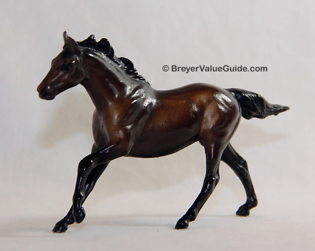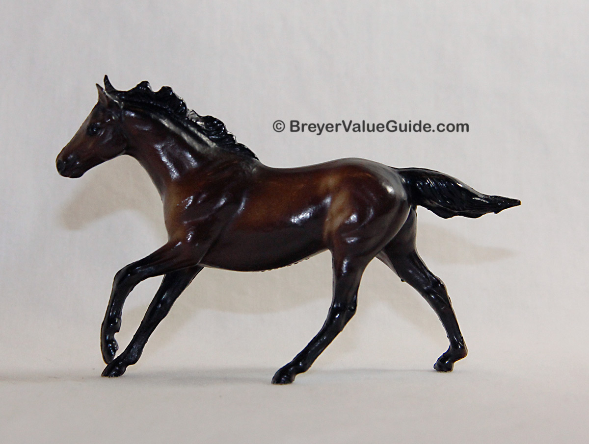 Matte to semigloss dark bay; black mane and tail; black points; some have socks Also released in #3085 Stablemates Stable Set