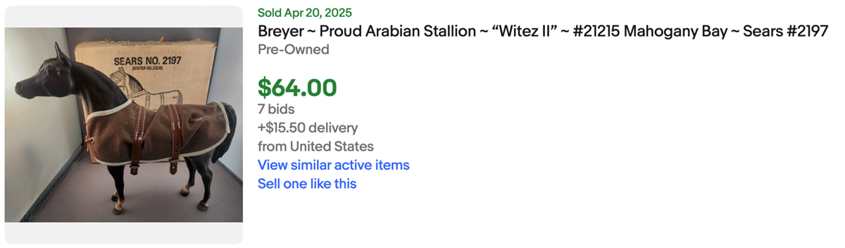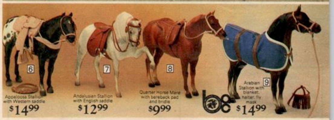 Sold through the 1978 Sears holiday catalog with a leather halter and lead, fly mask, and a blue canvas stable blanket with leather surcingles