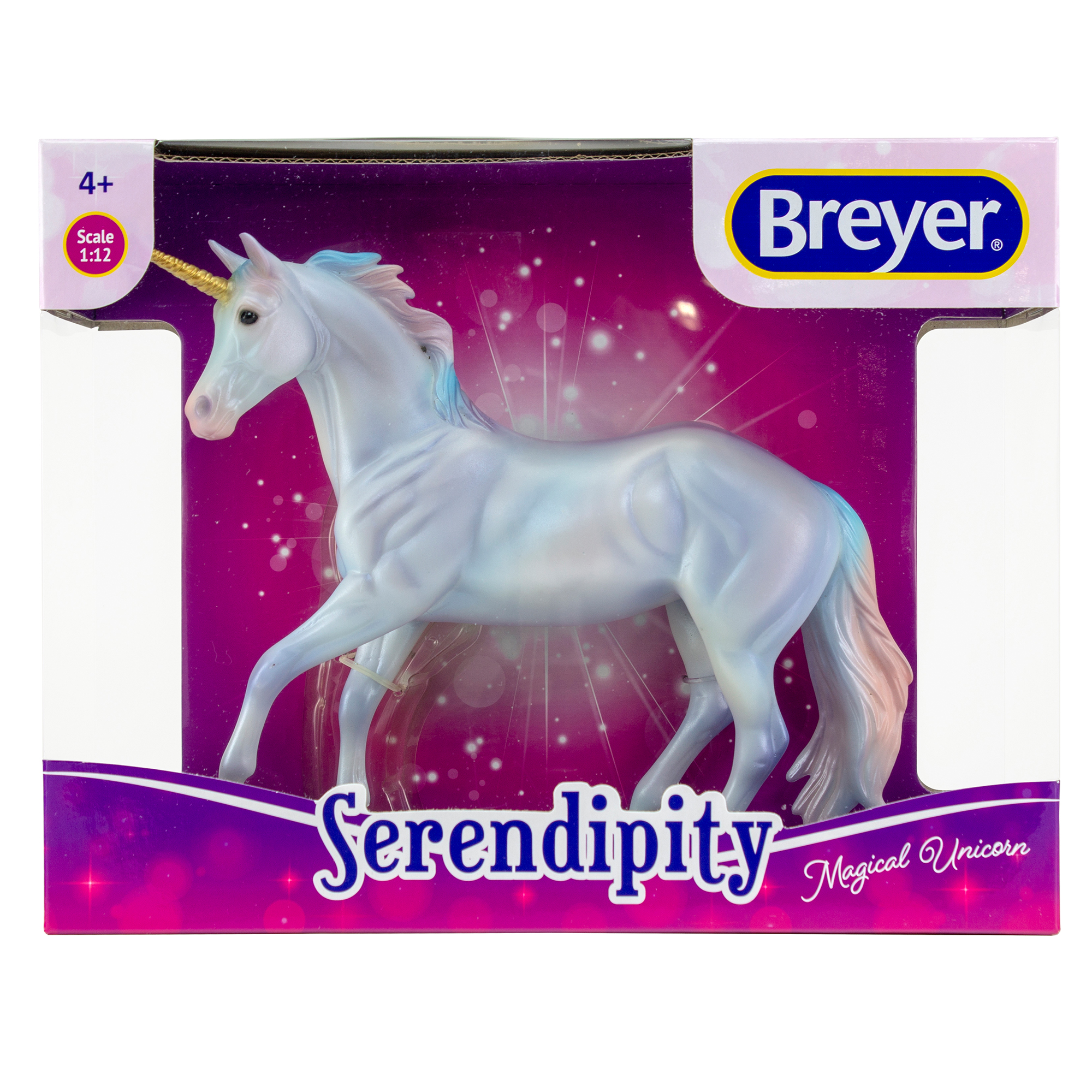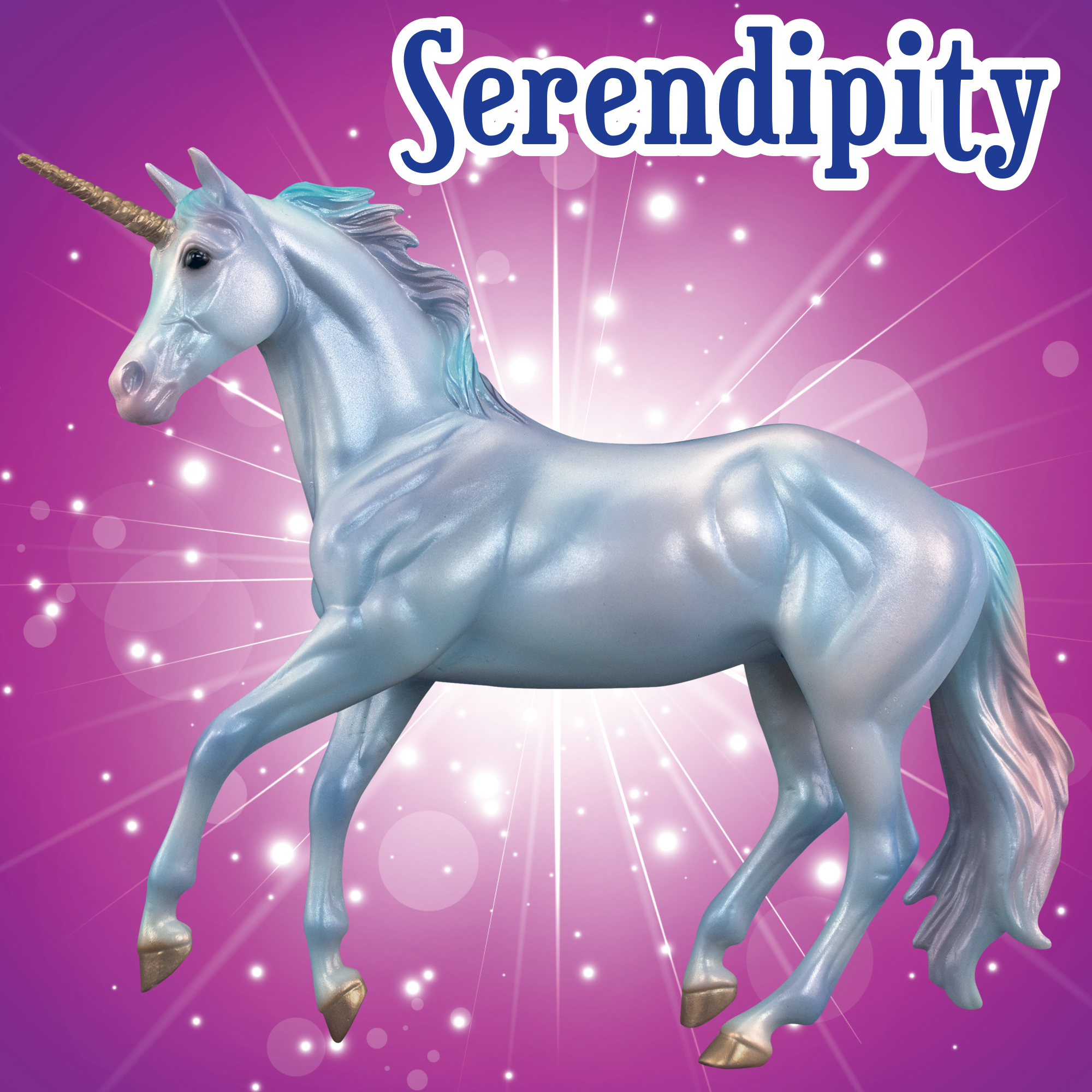 Matte light blue, blue and pink mane and tail, gold hooves and horn, WalMart release