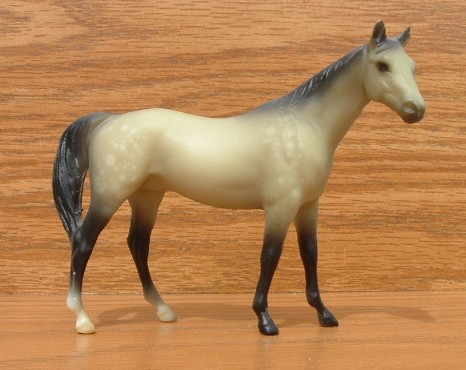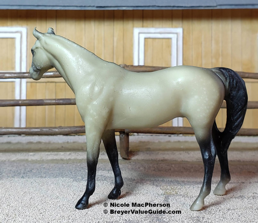 Matte light grey; resist dapples on shoulders and hips; black points; 2 hind socks; JCPenney SR