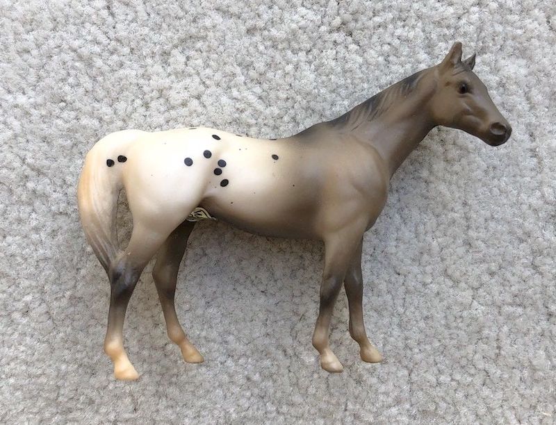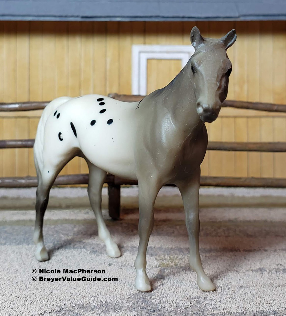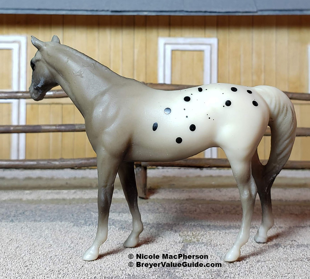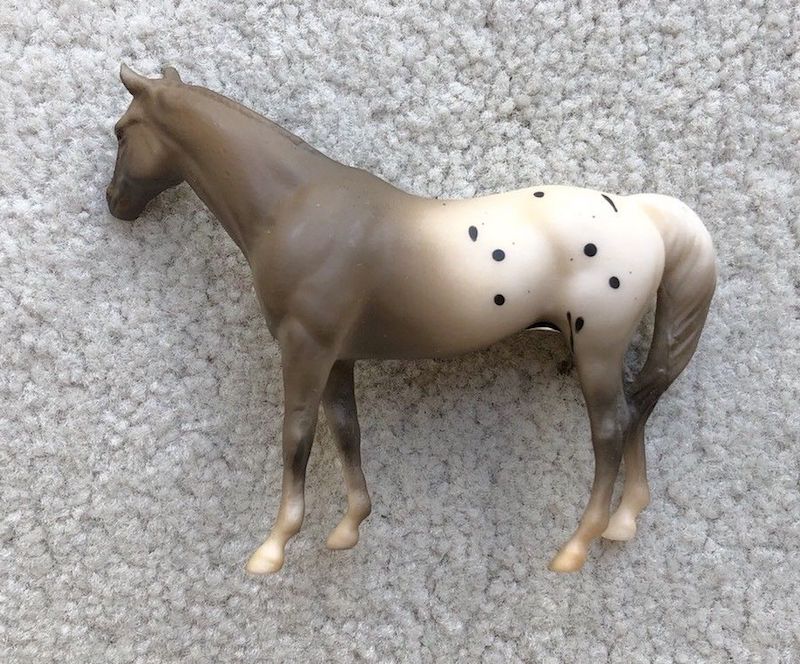 Matte liver chestnut blanket appaloosa; black splash spots; darker mane; shaded tail; 4 socks; JCPenney SR
