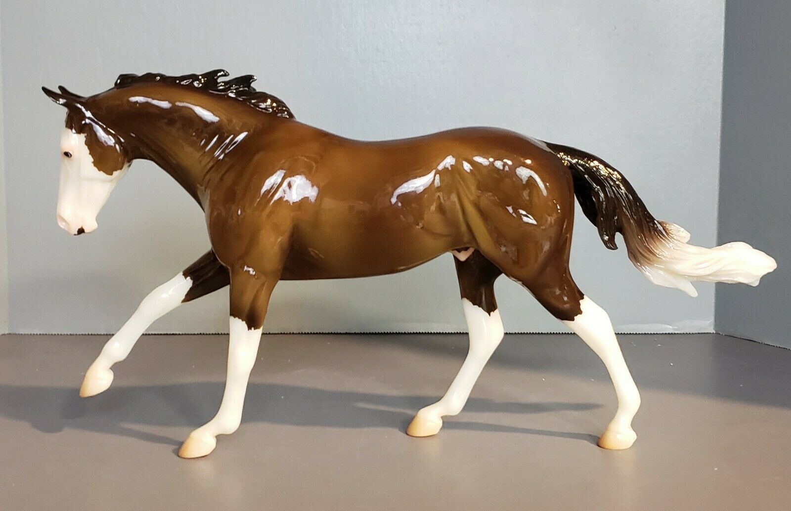 Glossy sable champagne minimal splash pinto, stenciled bald face, 4 stockings, BreyerFest SR, 1/325 glossy