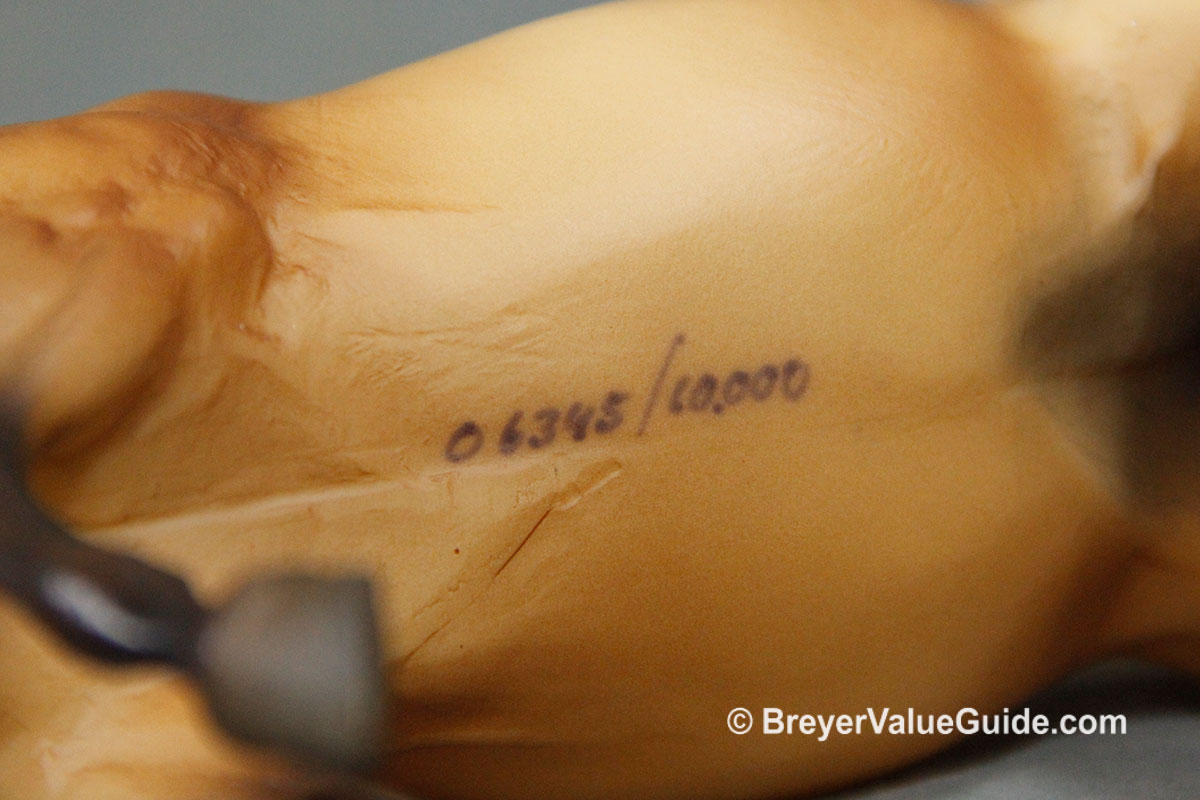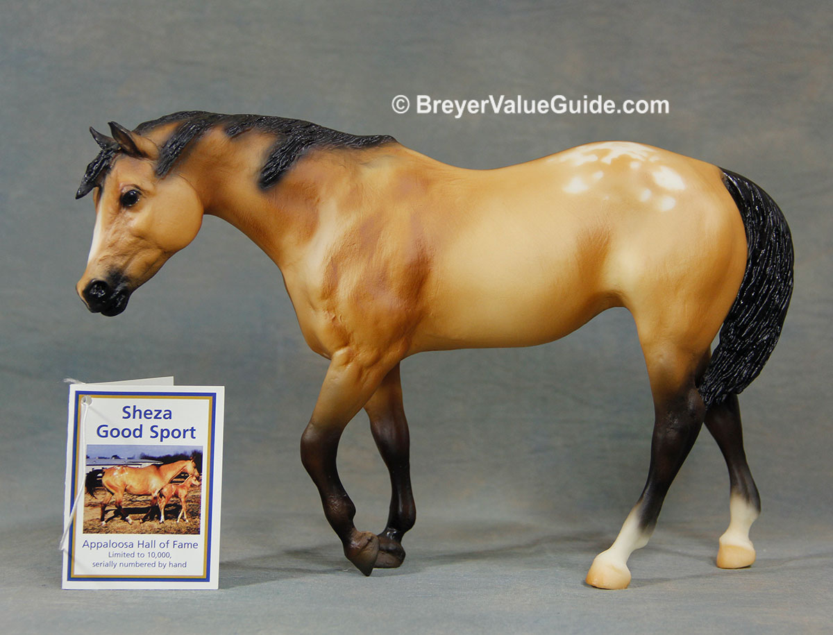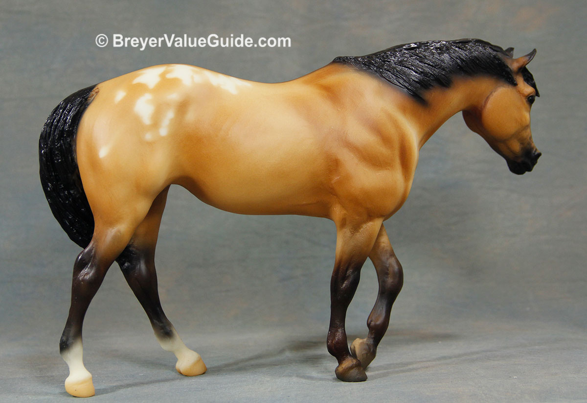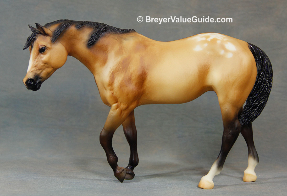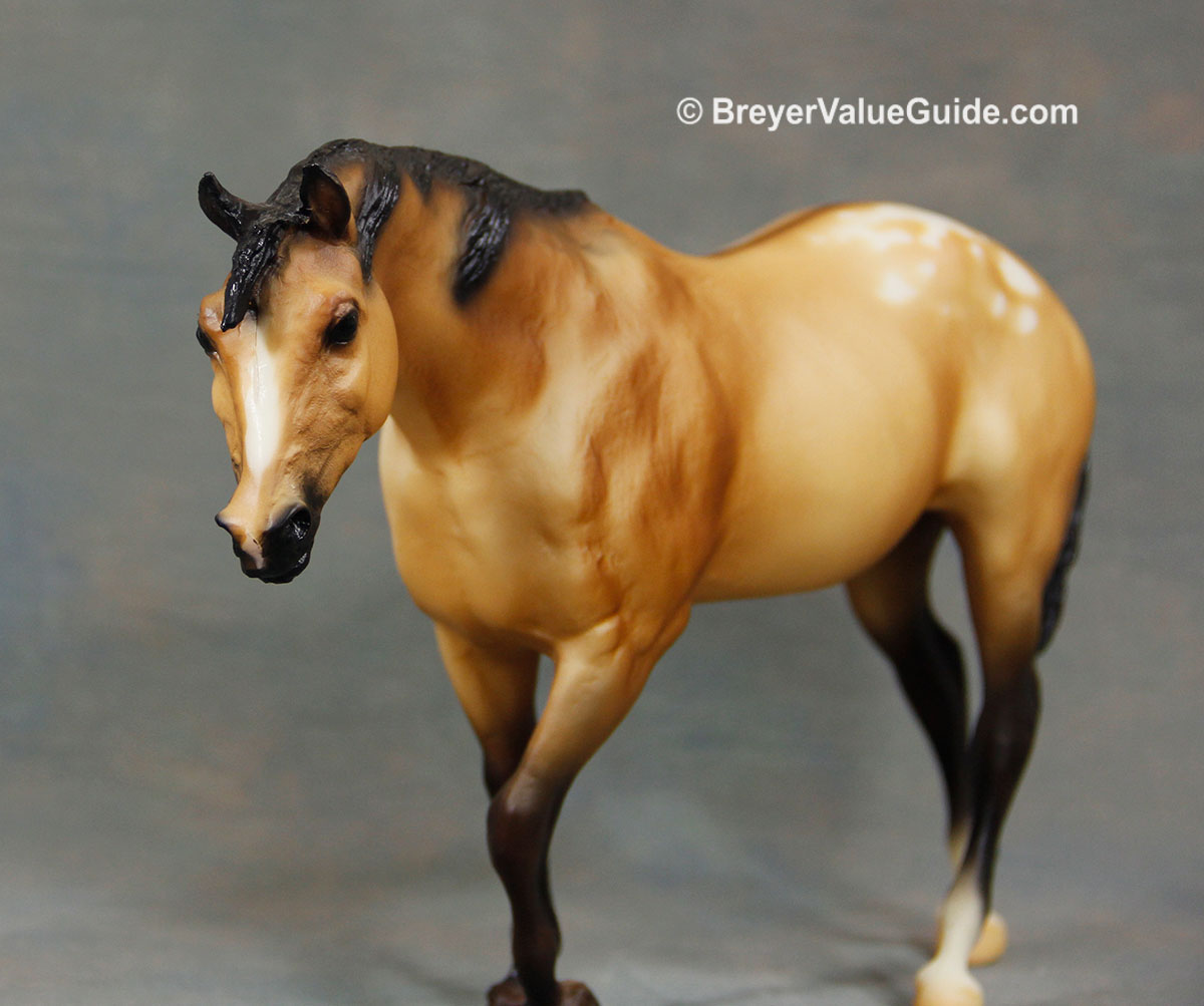Matte buckskin blanket appaloosa; stenciled spots, blaze, dorsal stripe, hind socks; hand numbered on belly, 1/10000