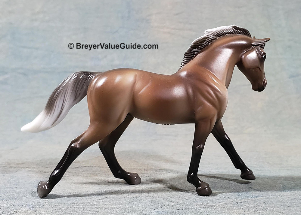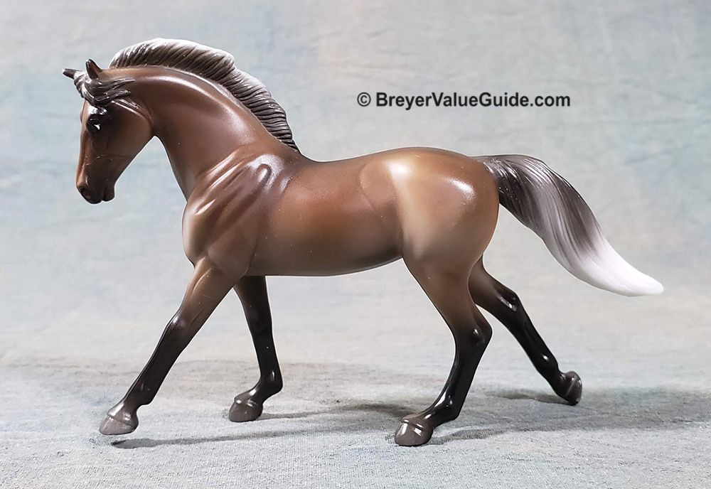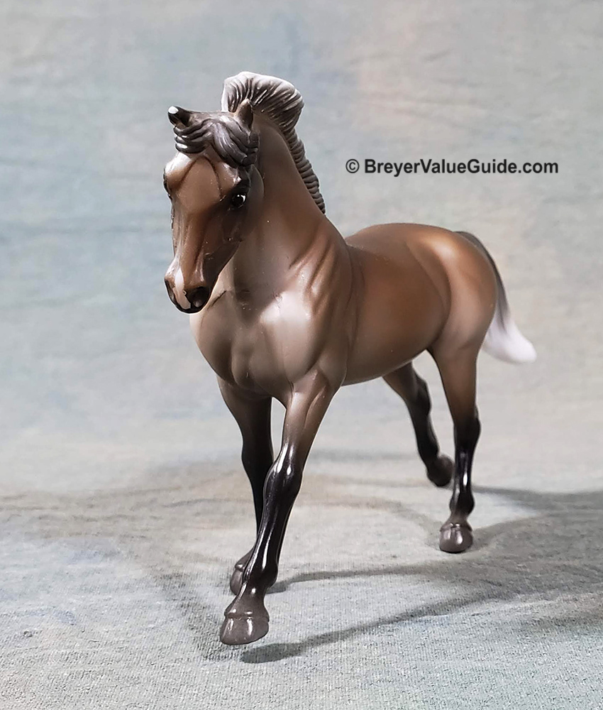 Matte rose grey; grey shaded mane and tail; snip; black points; grey hooves